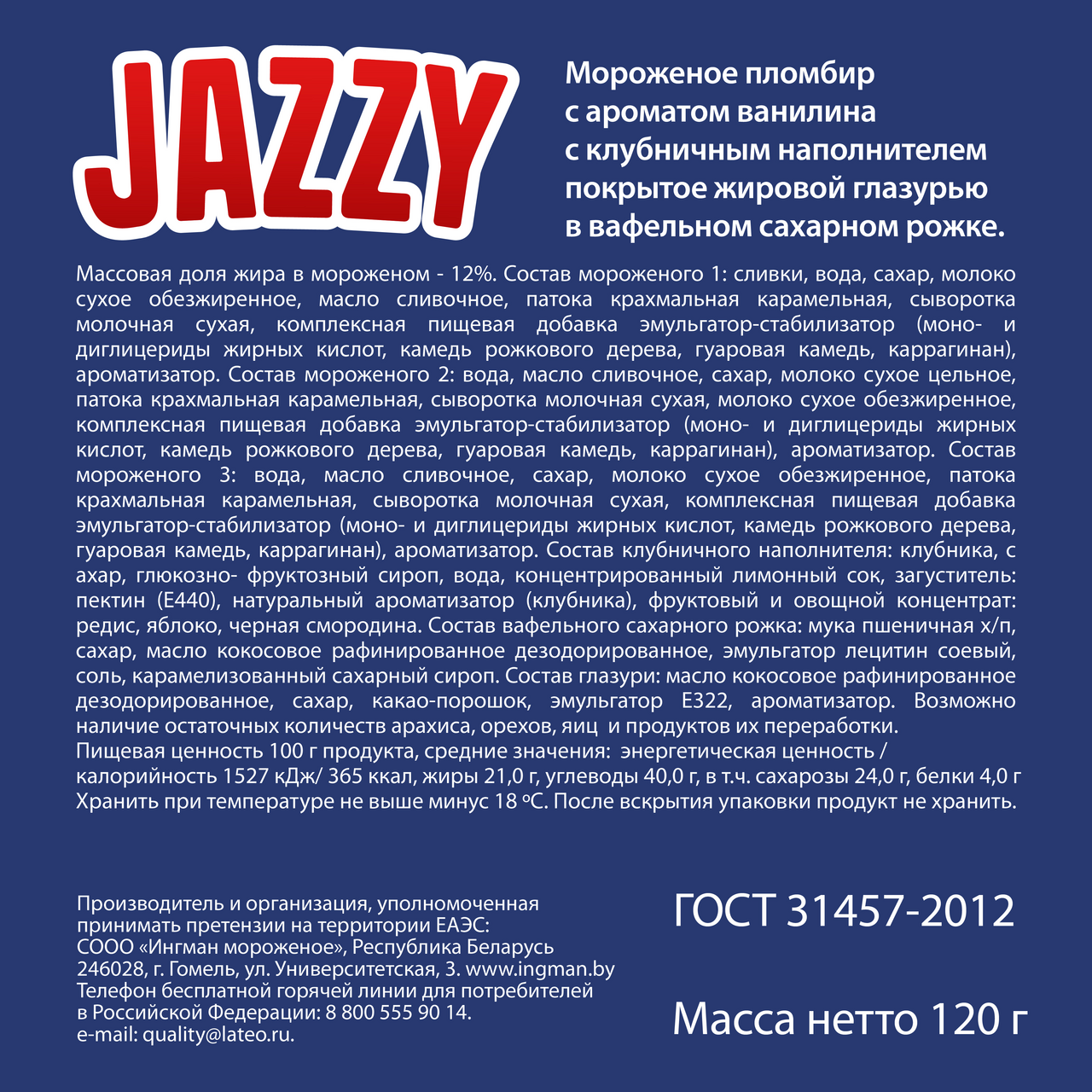 Мороженое пломбир Хладокомбинат №1 Jazzy Ванильное с клубничным наполнителем в вафельном рожке, 120г