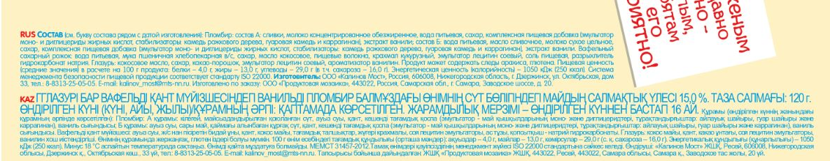 Сливки, молоко концентрированное обезжиренное, вода питьевая, сахар, комплексная пищевая добавка (эмульгатор моно- и диглицериды жирных кислот, стабилизаторы: камедь рожкового дерева, гуаровая камедь и каррагинан), экстракт ванили; состав Б: вода питьевая, масло сливочное, молоко сухое цельное, сахар, комплексная пищевая добавка (эмульгатор моно- и диглицериды жирных кислот, стабилизаторы: камедь рожкового дерева, гуаровая камедь и каррагинан), экстракт ванили. Вафельный сахарный рожок: вода питьевая, мука пшеничная хлебопекарная в/с, сахар, масло кокосовое, пищевые волокна, крахмал кукурузный, эмульгатор лецитин соевый, соль пищевая, разрыхлитель гидрокарбонат натрия. Глазурь: кокосовое масло, сахар, какао-порошок, эмульгатор лецитин соевый, ароматизатор ванилин. Продукт может содержать следы арахиса, глютена.