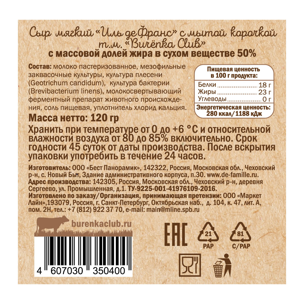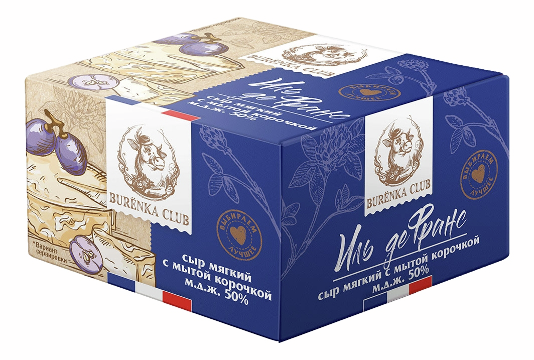 Иль де Франс Burenka Club – мягкий сыр с мытой корочкой. Именно эти сыры создали Франции репутацию страны с самыми ароматными сырами! Отмывание внешней поверхности сыра, способствует превращению плесневый корочки в корку, которая защищает внутреннюю часть сырной головки. Одновременно с ярким ароматом сыра, его вкус и текстура очень нежные и сливочные.