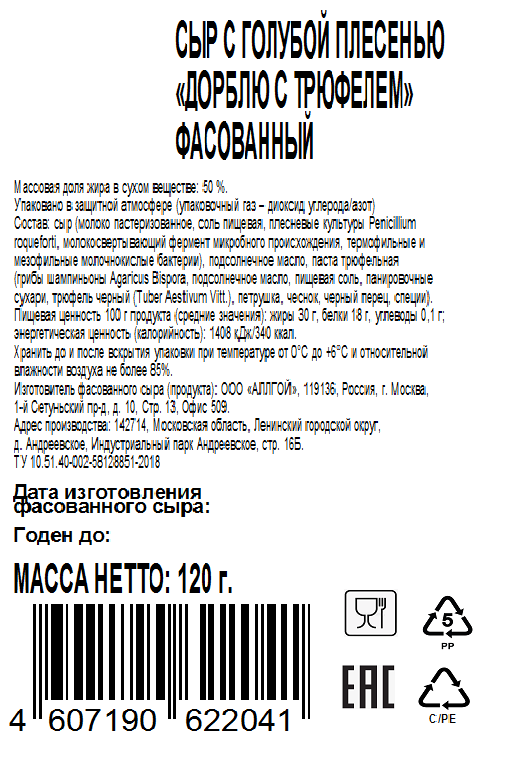 Сыр (молоко пастеризованное, соль пищевая, плесневые культуры Penicillium roqueforti, молокосвертывающий фермент микробного происхождения, термофильные и мезофильные молочнокислые бактерии), подсолнечное масло, паста трюфельная (грибы шампиньоны Agaricus Bispora, подсолнечное масло, пищевая соль, панировочные сухари, трюфель черный (Tuber Aestivum Vitt.), петрушка, чеснок, черный перец, специи).