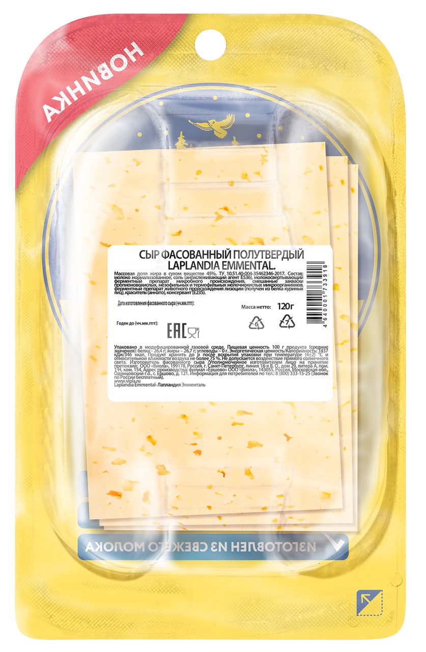 Сыр Laplandia Emmental полутвердый нарезка 45%, 120г
