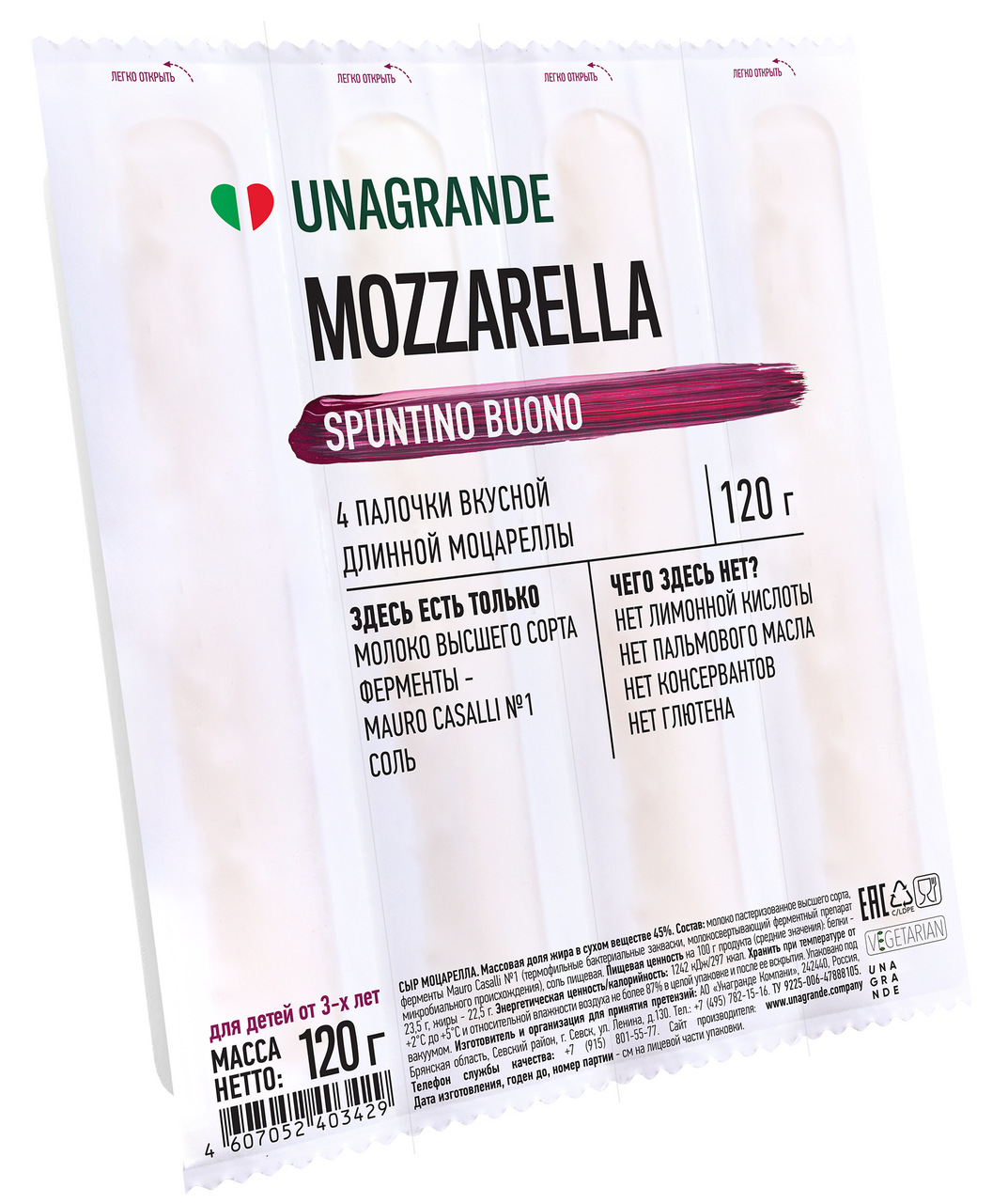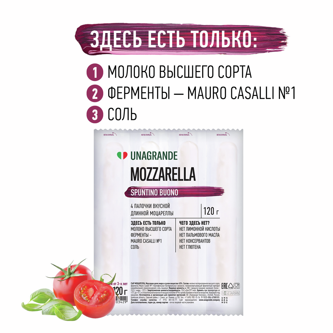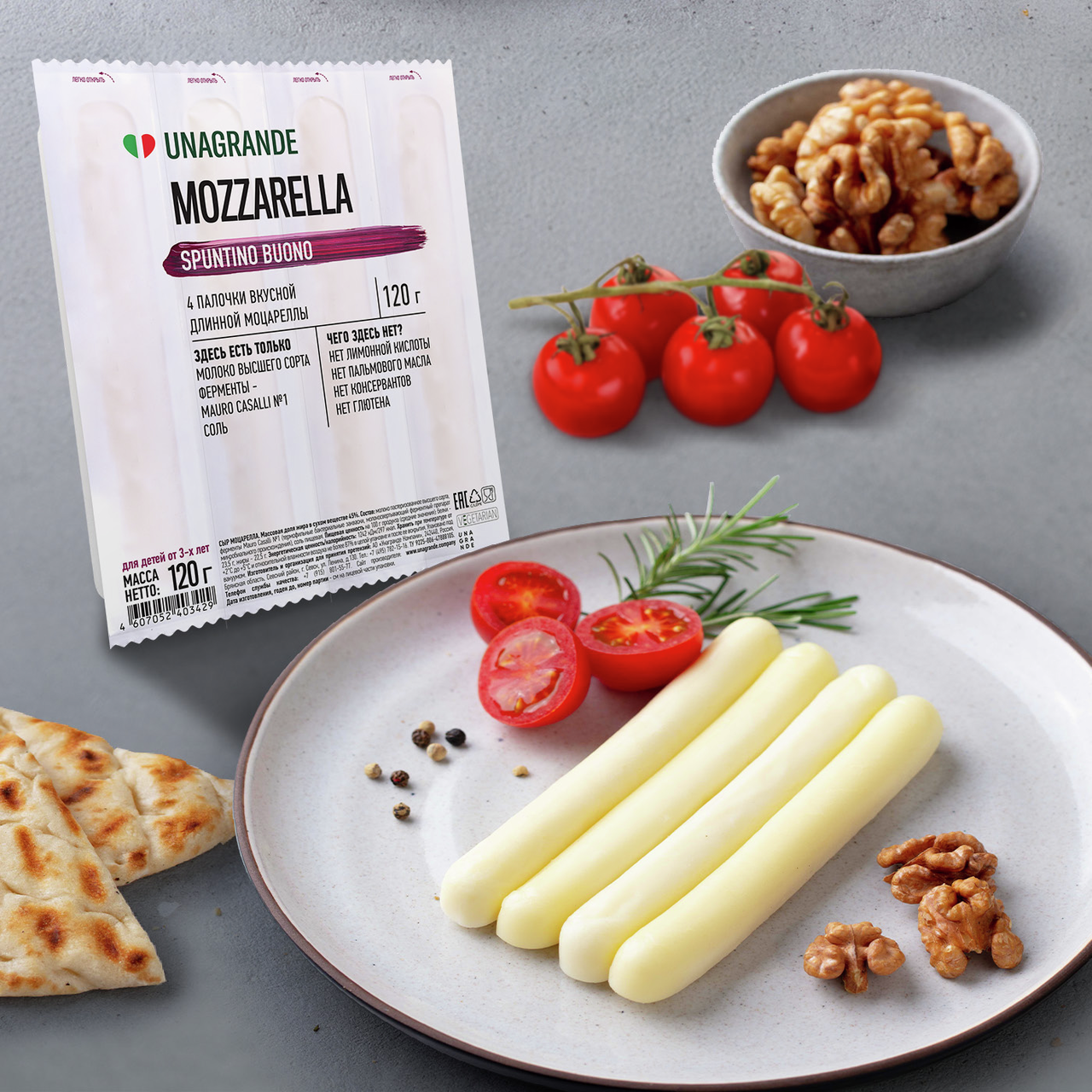 Сыр моцарелла Unagrande палочки 45%, 120г БЗМЖ (без заменителя молочного жира) – уникальный по качественным и вкусовым характеристикам продукт. Обладает нежным, сбалансированным молочным вкусом, обладает нежной, мягкой текстурой. Отлично подходит в качестве самостоятельного продукта, для нарезки на праздничный и повседневный стол, приготовления классических бутербродов. С моцареллой можно приготовить множество классических и необычных блюд. Его применяют для посыпки пиццы, в качестве начинки в пирожки и булочки, одного из ингредиентов салатов, первых и вторых блюд. Отлично заменит любой сырный продукт для создания простейших или эксклюзивных закусок.