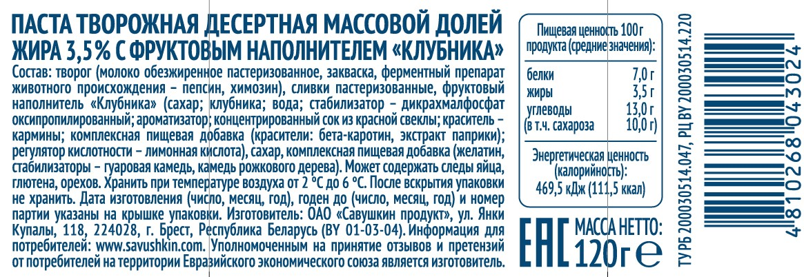 Творожок Савушкин продукт клубника 3.5%, 120г