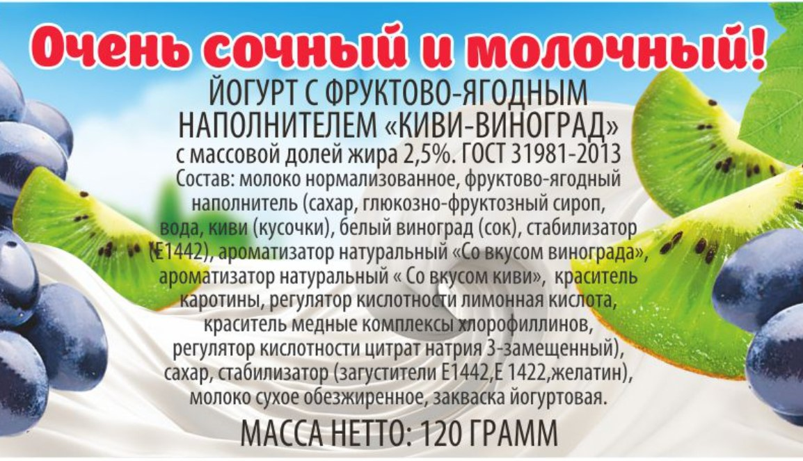 Молоко нормализованное, фруктово-ягодный наполнитель (сахар, глюкозно-фруктозный сироп, вода, киви ( кусочки), белый виноград (сок), стабилизатор крахмал модифицированный Е 1442, ароматизатор натуральный Со вкусом киви, краситель каротин, ароматизатор натуральный Со вкусом винограда, ароматизатор натуральный, регулятор кислотности лимонная кислота, краситель медные комплексы хлорофиллинов , регулятор кислотности цитрат натрия 3-замещенный ), сахар, молоко сухое обезжиренное, стабилизаторы (желатин, крахмал кукурузный, Е1422, пектин), закваска йогуртовых культур.