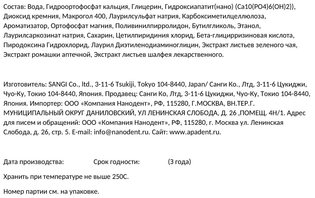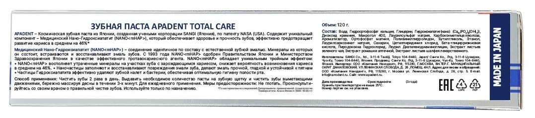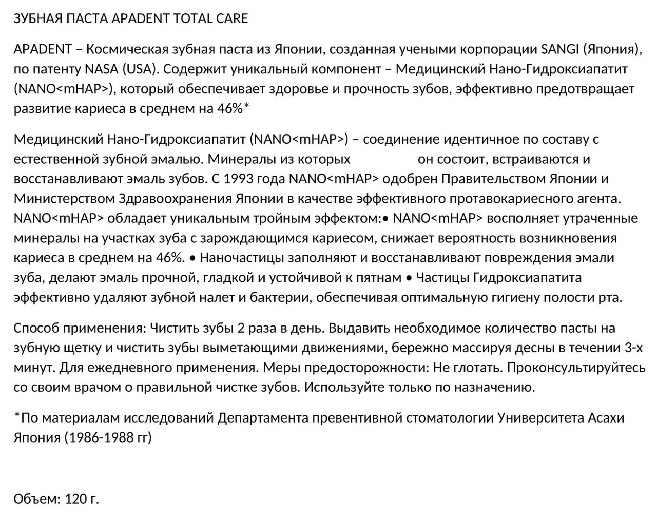 Лечебно-профилактическая японская зубная паста Apadent Total Care с Медицинским Нано-Гидроксиапатитом глубоко реминерализует и восстанавливает эмаль, борется с чувствительностью зубов и предотвращает развитие кариеса. Без фтора. Все заявленные свойства подтверждены клиническими исследованиями на протяжении 40 лет. Эмаль зубов на 97% состоит из Гидроксиапатита. В зубной пасте Apadent Гидроксиапатит Кальция содержится в форме нано-частиц, что позволяет ему проникать глубоко в структуру эмали и восполнять потери минералов на истощенных участках, встраиваясь в ткани зуба на молекулярном уровне. Высокая биодоступность и биосовместимость Нано-Гидроксиапатита (NANO) позволяет восстанавливать эмаль глубоко изнутри, а не только на поверхности, в отличие от других зубных паст. Зубная паста Apadent Total Care универсальна. Рекомендуется в том числе беременным женщинам, обладателям чувствительных зубов, пользователям брекет-систем и детям после того, как они научились сплевывать пасту.