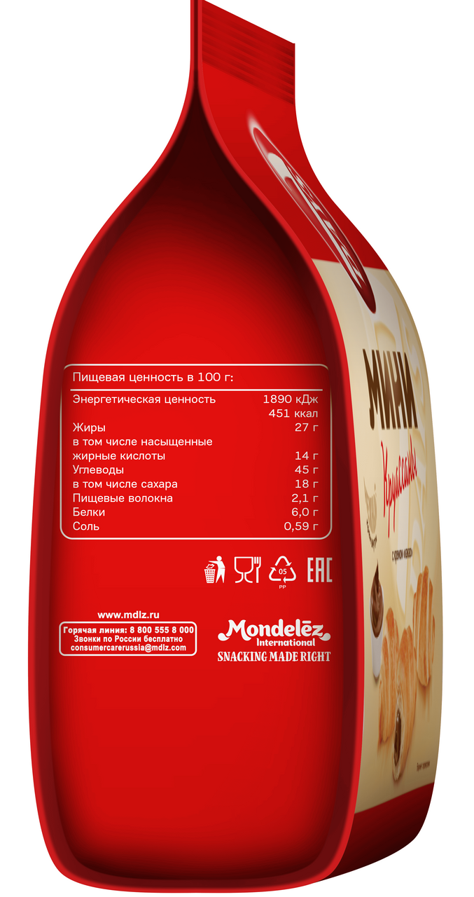Мука пшеничная хлебопекарная высшего сорта, вода, масла растительные (пальмовое, подсолнечное), сахар, жир растительный (пальмовый), сироп глюкозный, какао-порошок, дрожжи хлебопекарные прессованные, молоко сухое обезжиренное, эмульгаторы (моно- и диглицериды жирных кислот, эфиры полиглицерина и жирных кислот), соль, спирт этиловый ректификованный из пищевого сырья, ароматизатор, консерванты (пропионат кальция, сорбат калия), загуститель (альгинат натрия), продукт яичный.