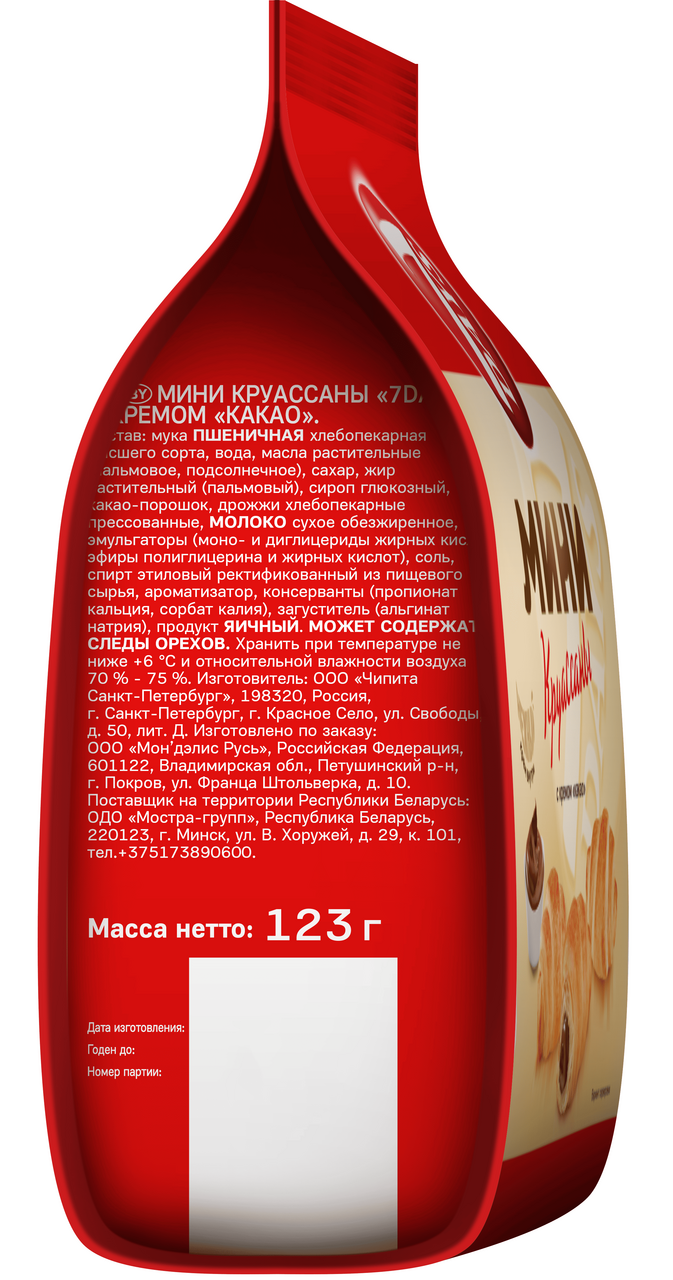 Насыщенный яркий вкус крема какао в каждом мини круассане. Круассан 7 days идеально сочетается с чаем и кофе, но не менее приятен в дополнение к сокам, воде или другим напиткам. Попробуйте яркую аппетитную выпечку, дарите себе и своим близким радостные мгновения каждый день.