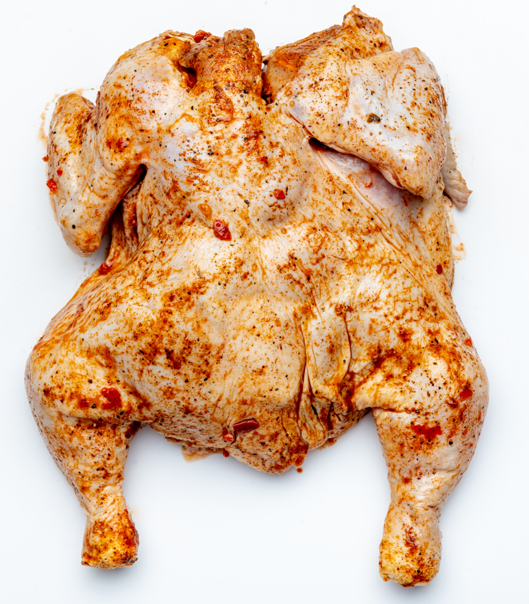 Тушка цыпленка бройлера, вода питьевая, соль пищевая, натуральные специи и пряности: карри смесь, паприка резанная, паприка сладкая сухая, пажитник молотый, сумах сухой, перец черный молотый, регулятор кислотности Е 330 (лимонная кислота), чеснок сухой порошок, перец кайенский острый. Продукт может содержать следы горчицы и орехов.