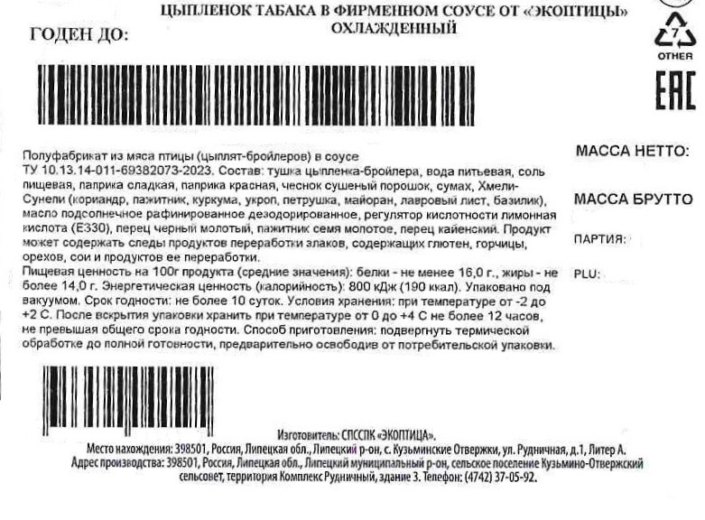 Цыпленок-табака Экоптица в фирменном соусе охлажденный, ~1.25кг