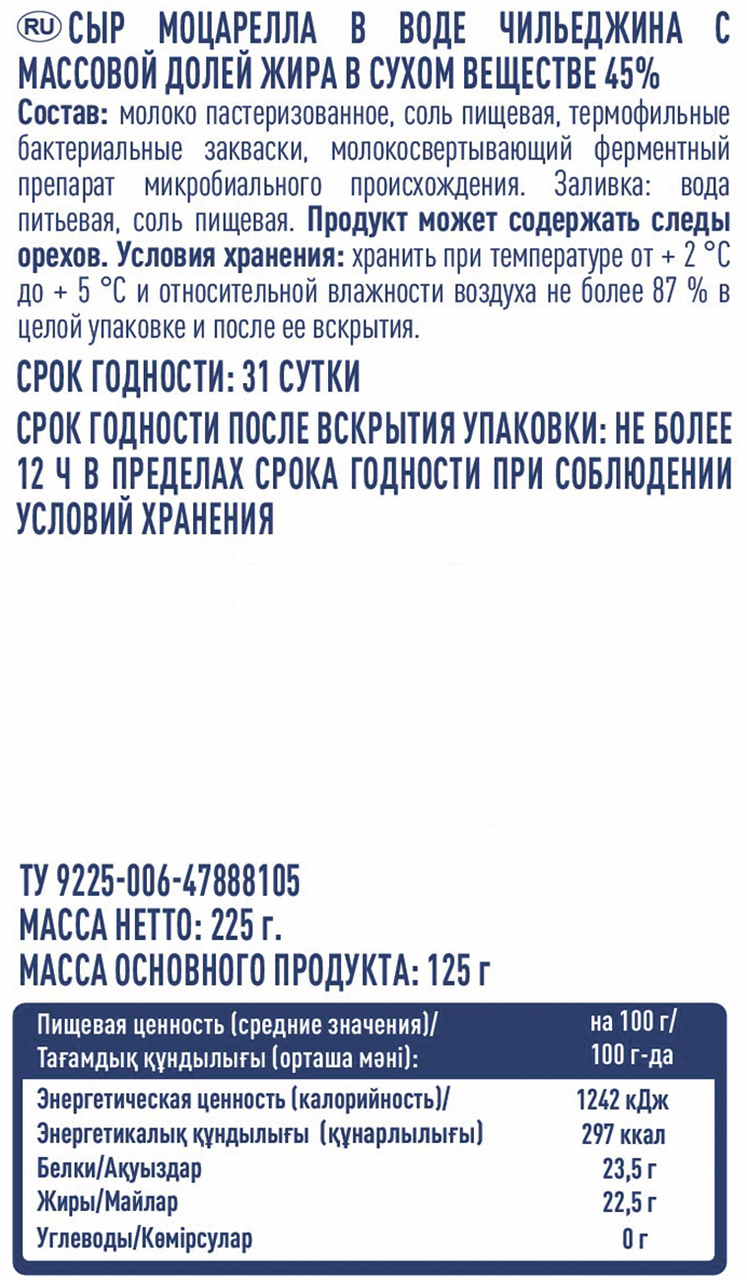 Молоко пастеризованное, соль пищевая, термофильные бактериальные закваски, молокосвертывающий ферментный препарат микробиального происхождения; заливка: вода питьевая, соль пищевая.