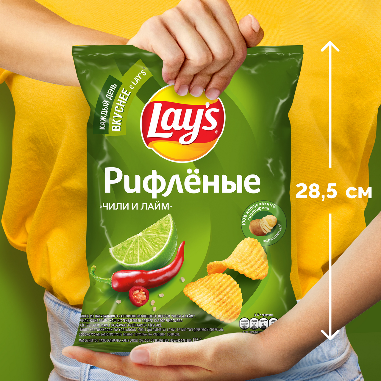 Lay's - чипсы, каждая пачка которых изготовлена из отборного картофеля и соответствует самым высоким стандартам качества. Встречайте Lay's Чили и лайм - хрустящие рифленые чипсы с пикантным вкусом чили и лайма. В этой пачке Лейс вас ждет настоящее удовольствие - яркий вкус перца чили с лаймом в сочетании с натуральным картофелем подарят вихрь наслаждения и новые гастрономические впечатления. Изготовлены из специально отобранного картофеля и соответствуют самым высоким стандартам качества. Созданы для ценителей острого и яркого вкуса.