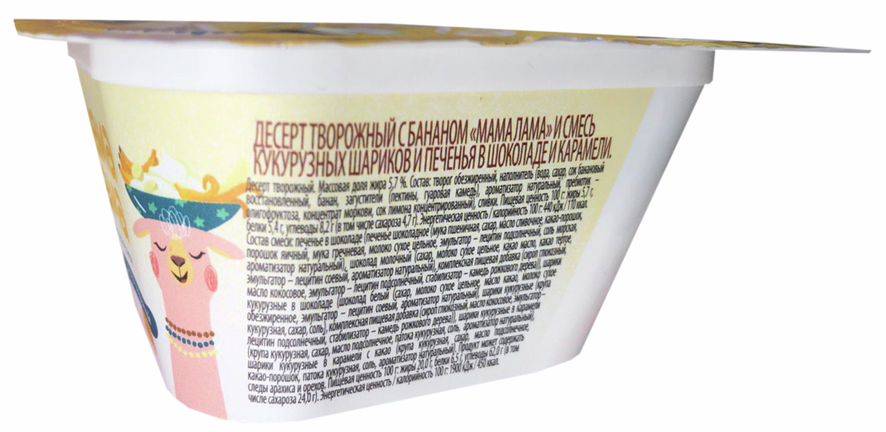 Десерт творожный Мама Лама банан 5.7%, 125г - это отличная альтернатива десертам из натурального творога. У этого десерта приятный вкус. Он одинаково понравится детям и взрослым, подойдет для легкого перекуса или станет отличной заменой конфетам. Нежная текстура творожка в сочетании с хрустящими насыпками — это лучшее сочетание вкуса и пользы, которую не нужно объяснять. Продукт предназначен для питания детей дошкольного и школьного возраста (для детей старше 3-х лет). Перед употреблением рекомендуется смешать содержимое двух стаканчиков. Лакомство поставляется в удобной упаковке.