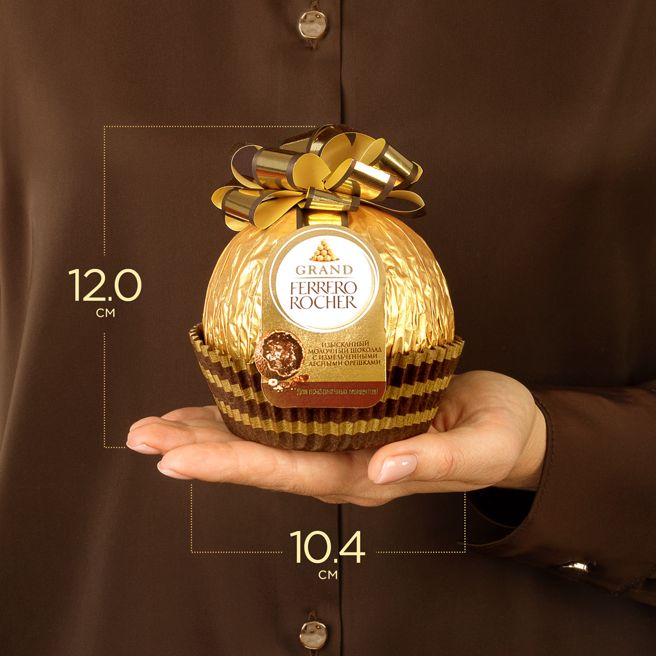 Фигурный молочный шоколад с дробленными лесными орехами Grand Ferrero Rocher (молочный шоколад (сахар, масло какао, тертое какао, сухое обезжиренное молоко, молочный жир, эмульгатор: лецитины, ароматизатор), дробленые лесные орехи); две конфеты хрустящие Ferrero Rocher из молочного шоколада, покрытые измельченными орешками, с начинкой из крема и лесного ореха (молочный шоколад (сахар, масло какао, тертое какао, сухое обезжиренное молоко, молочный жир, эмульгатор: лецитины, ароматизатор), лесные орехи, сахар, растительный жир, пшеничная мука, сухая молочная сыворотка, обезжиренный какао-порошок, эмульгатор: лецитины, разрыхлитель: гидрокарбонат натрия, соль, ароматизатор).