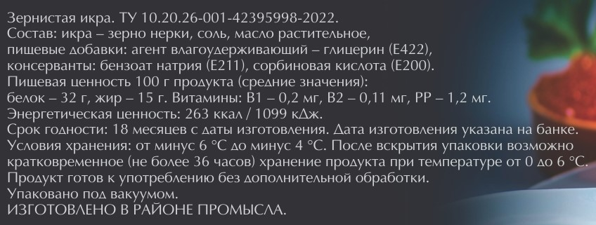 Икра (зерно) дальневосточных лососёвых рыб, соль поваренная, масло подсолнечное рафинированное, пищевые добавки: глицерин пищевой Е422; консерванты: Е211,Е200.