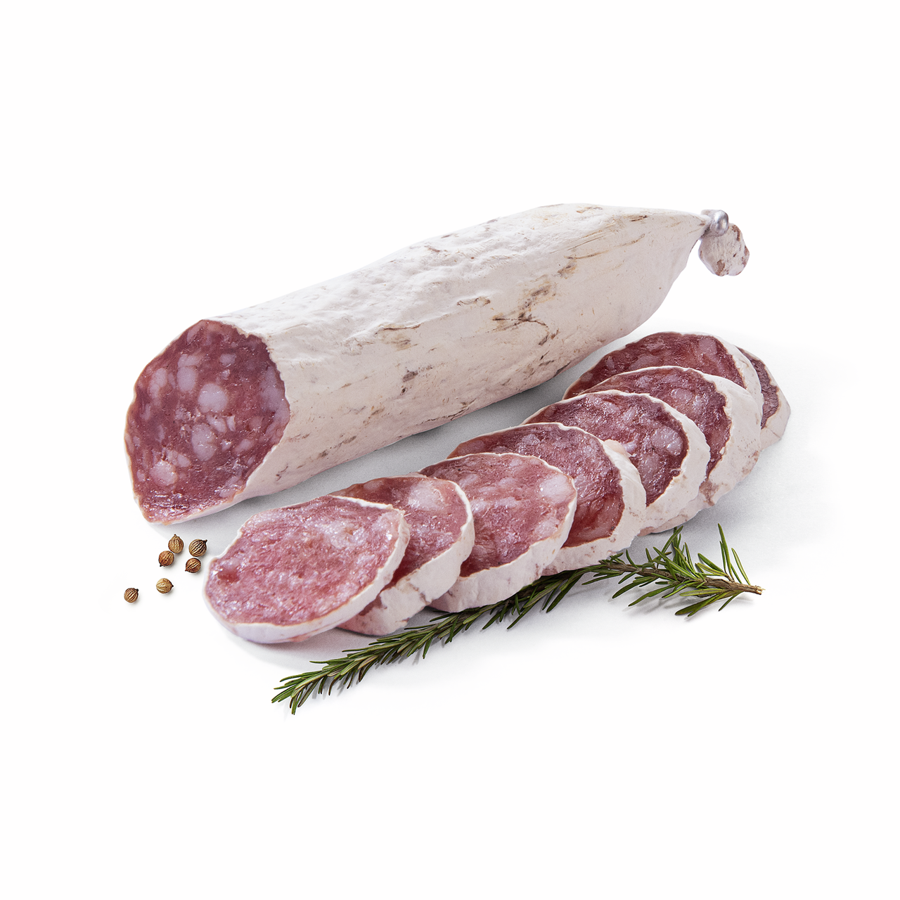 Свинина, шпик, нитритно-посолочная смесь (соль, фиксатор окраски - нитрит натрия), декстроза, пряности (перец белый, кориандр, шалфей), экстракты пряностей (перец черный, базилик), стартовые культуры, чистая культура белой плесени (Penicillium nalgiovensis, Penicillium candidum).
