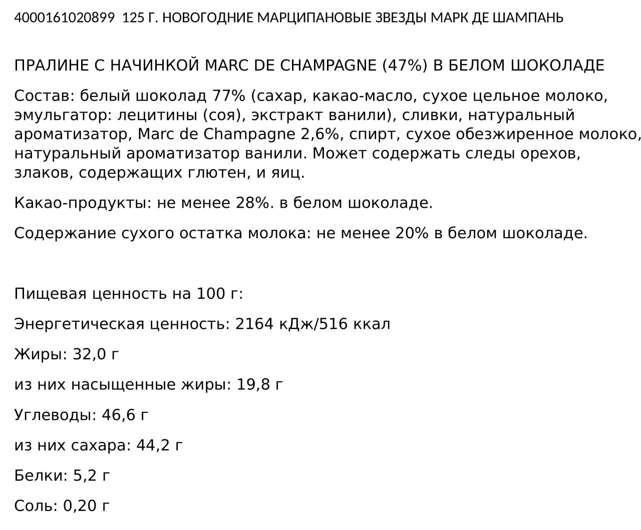 Белый шоколад сахар, какао-масло, цельное сухое молоко, эмульгатор: лецитины сои, экстракт ванили, сливки, натуральный ароматизатор, Marc de Champagne, алкоголь, обезжиренное сухое молоко, натуральный ароматизатор ванили.
