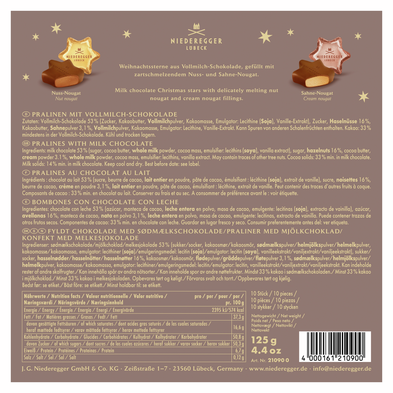 Новогодние звезды с нежной нугой - сладкое воплощение праздника. Прекрасный выбор для подарка и семейного чаепития. Ниедериггер - символ немецкого качества и традиций. Продукция бренда известна своим натуральным составом и изысканным вкусом.
