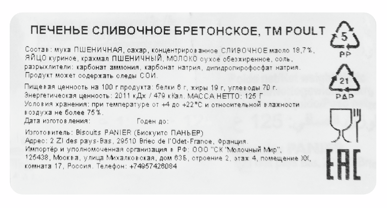 Печенье Poult Сливочное бретонское, 125 г представляет собой вкусный десерт, который не оставит никого равнодушным. Представленное лакомство станет отличным дополнением к чаю или кофе. Мягкая, воздушная текстура, приятный сливочный аромат и нежный вкус делают этот десерт любимым лакомством сладкоежек всех возрастов. Печенье приготовлено из пшеничной муки высшего сорта. На этикетке с фирменным логотипом производителем размещена информация о полном составе, энергетической ценности (белки, жиры и углеводы, калорийность), дате изготовления, иные важные сведения, имеющие значение для покупателя. Конфеты и печенье – неотъемлемая часть подарка. Им обрадуются взрослые и маленькие сладкоежки. К тому же это отличная альтернатива калорийным пирожным и тортам и хорошая идея для похода в гости.