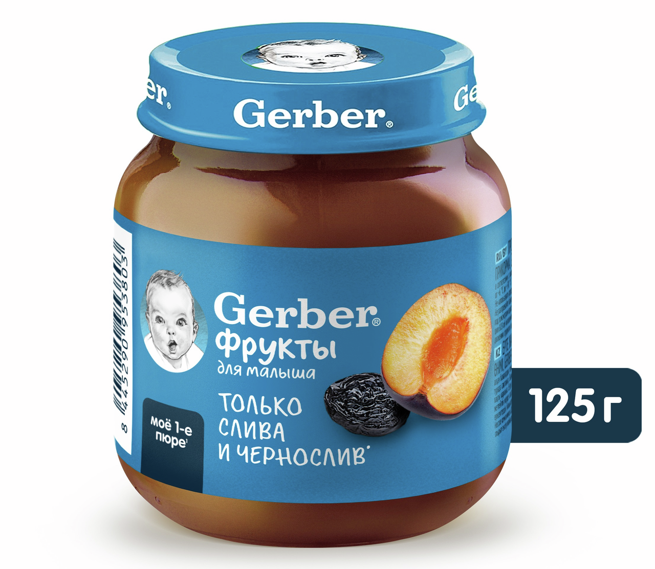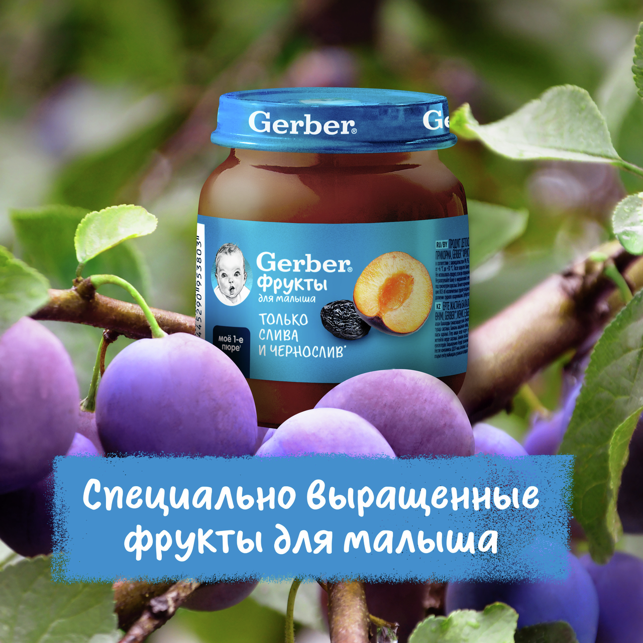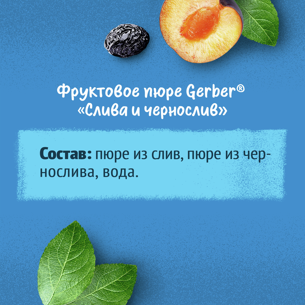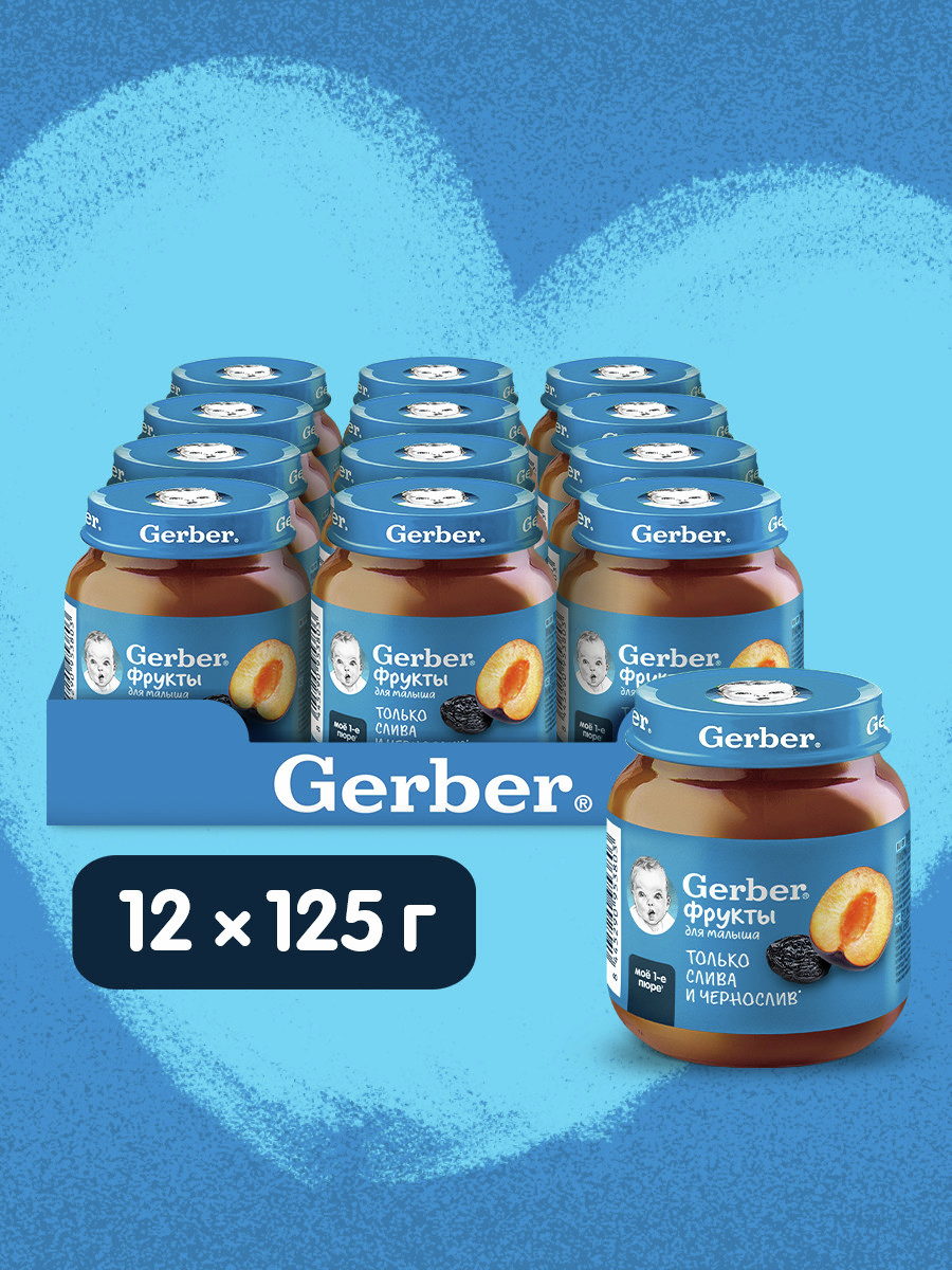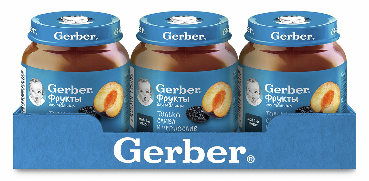 Продукт детского питания для детей раннего возраста, продукт прикорма, фруктовое пюре Слива и Чернослив. Для питания детей с 5 месяцев. Гомогенизированное. Стерилизованное. Готово к употреблению. Мы предъявляем самые строгие требования к качеству наших продуктов, что позволяет нам выбрать лучшие ингредиенты, которые станут пюре Gerber(r): Стандарты качества Gerber по многим параметрам превосходит государственные стандарты качества, принятые в разных странах Наши продукты проходят более 120 проверок на качество на всех этапах производства Фрукты и овощи выращены на полях проверенных поставщиков Только отборные фрукты становятся пюре Gerber. Любовь и забота в каждой ложечке. Изготовлено без использования генетически модифицированных ингредиентов, искусственных консервантов, красителей и ароматизаторов. Без добавления крахмала, соли и сахара. Важное примечание: идеальной пищей для грудного ребенка является молоко матери. Всемирная организация здравоохранения рекомендует исключительно грудное вскармливание в первые шесть месяцев и последующее введение прикорма при продолжении грудного вскармливания. Компания Нестле поддерживает данную рекомендацию. Для принятия решения о сроках и способе введения данного продукта в рацион ребенка необходима консультация специалиста.