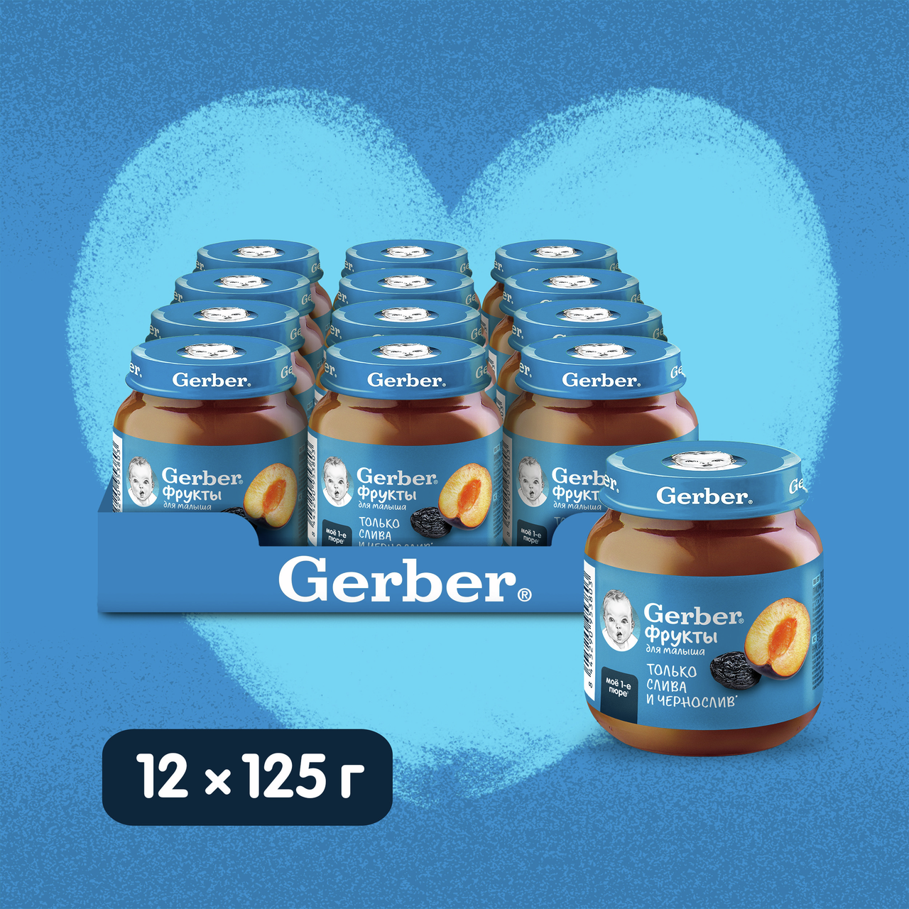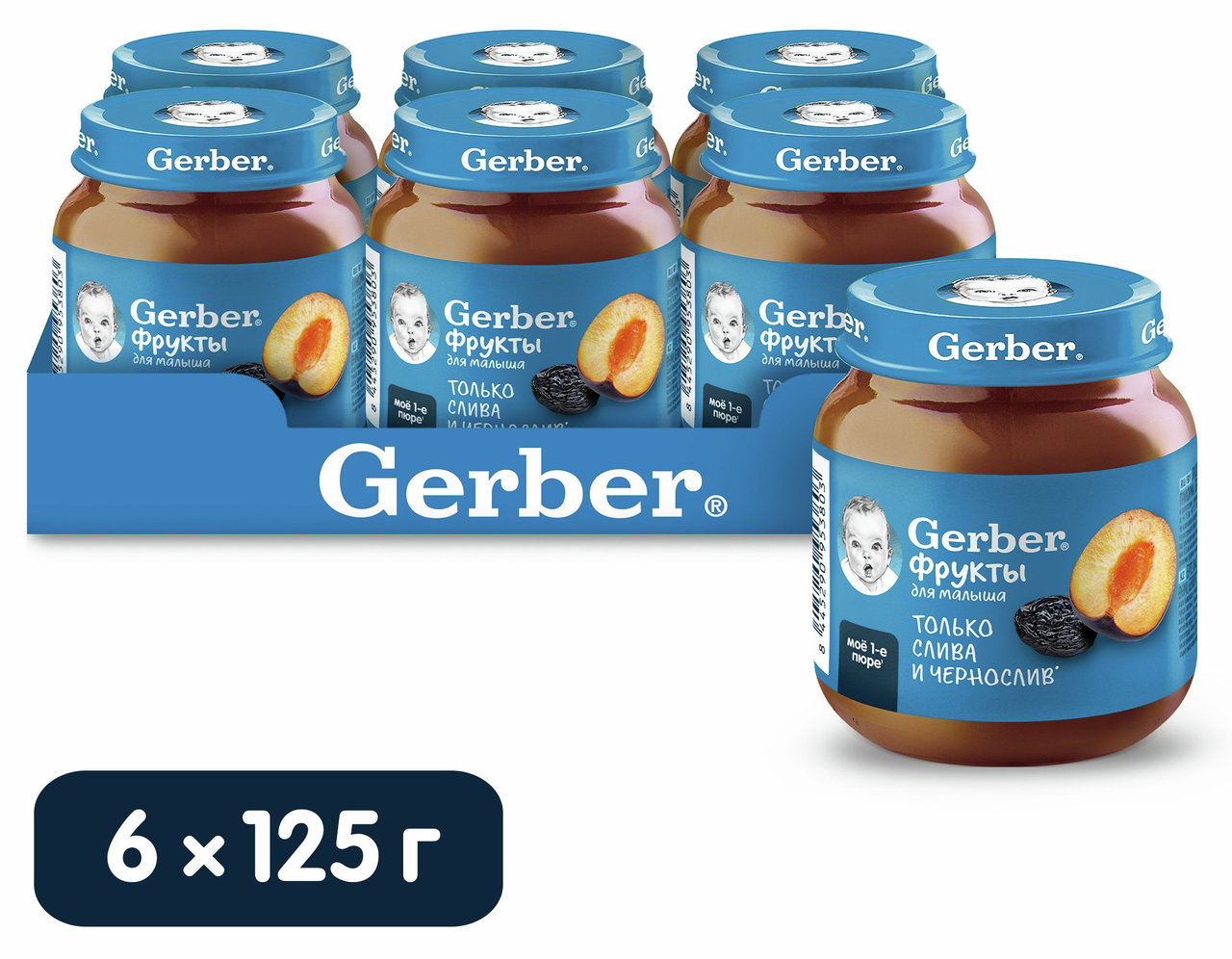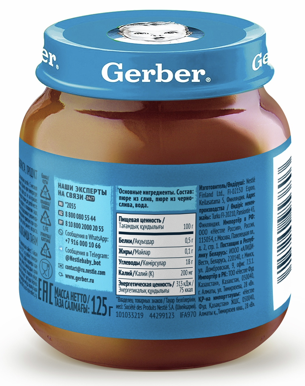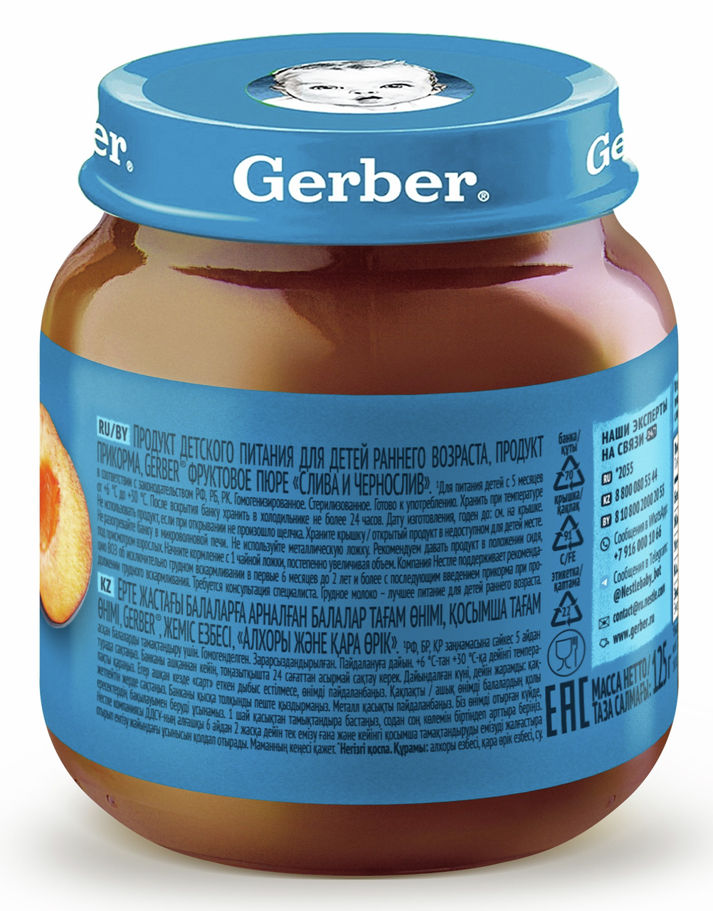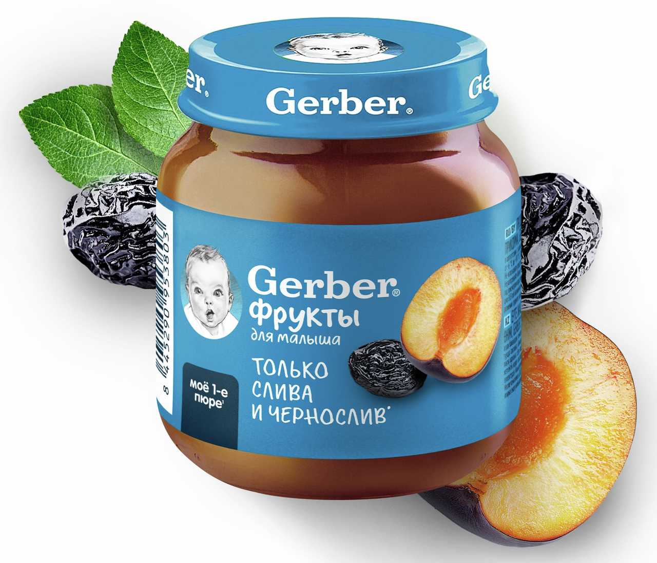 Продукт детского питания для детей раннего возраста, продукт прикорма, фруктовое пюре Слива и Чернослив. Для питания детей с 5 месяцев. Гомогенизированное. Стерилизованное. Готово к употреблению. Мы предъявляем самые строгие требования к качеству наших продуктов, что позволяет нам выбрать лучшие ингредиенты, которые станут пюре Gerber(r): Стандарты качества Gerber по многим параметрам превосходит государственные стандарты качества, принятые в разных странах Наши продукты проходят более 120 проверок на качество на всех этапах производства Фрукты и овощи выращены на полях проверенных поставщиков Только отборные фрукты становятся пюре Gerber. Любовь и забота в каждой ложечке. Изготовлено без использования генетически модифицированных ингредиентов, искусственных консервантов, красителей и ароматизаторов. Без добавления крахмала, соли и сахара. Важное примечание: идеальной пищей для грудного ребенка является молоко матери. Всемирная организация здравоохранения рекомендует исключительно грудное вскармливание в первые шесть месяцев и последующее введение прикорма при продолжении грудного вскармливания. Компания Нестле поддерживает данную рекомендацию. Для принятия решения о сроках и способе введения данного продукта в рацион ребенка необходима консультация специалиста.