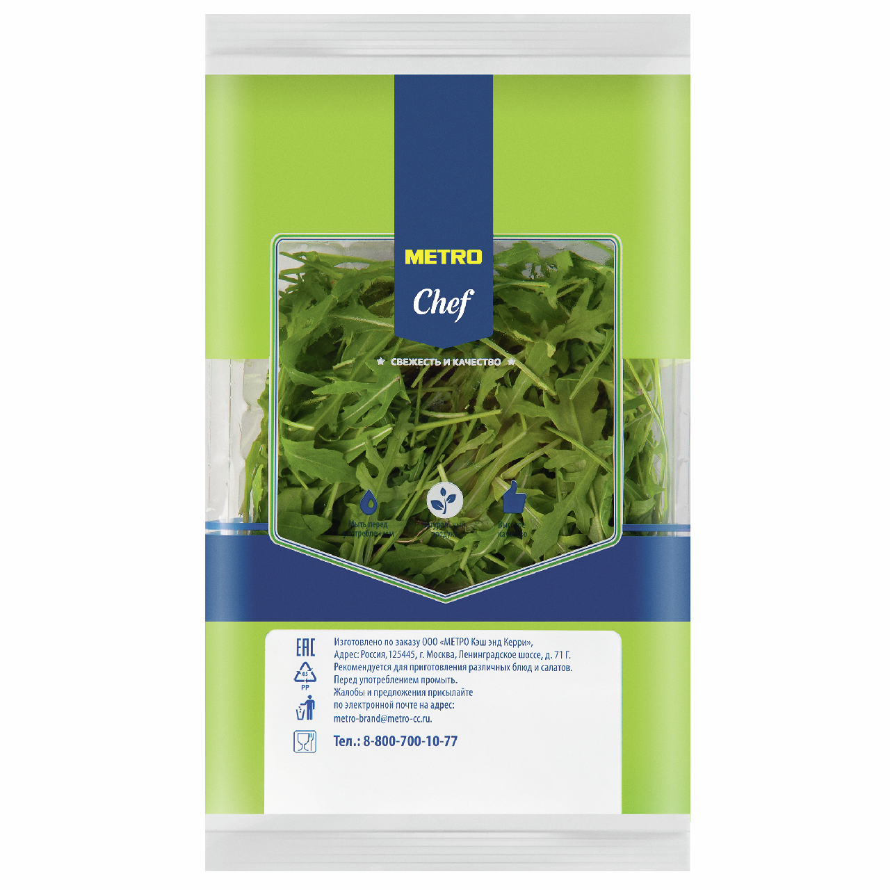 METRO Chef Салат Рукола, 125г обладает насыщенным ароматом и приятным вкусом с пикантной горчинкой. Ее можно употреблять в пищу в качестве самостоятельного блюда, добавлять в сэндвичи, супы и овощные салаты, а также использовать для усиления вкуса мясных, рыбных блюд и птицы. Руккола – незаменимый ингредиент для салатов с овощами, сырами, мясом, курицей, морепродуктами, орехами и даже фруктами. Она отлично сочетается с оливковым маслом, лимонным соком и солью. Выращенная в экологически чистых условиях зелень несет огромную пользу для организма.