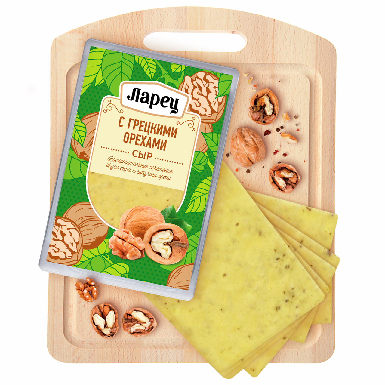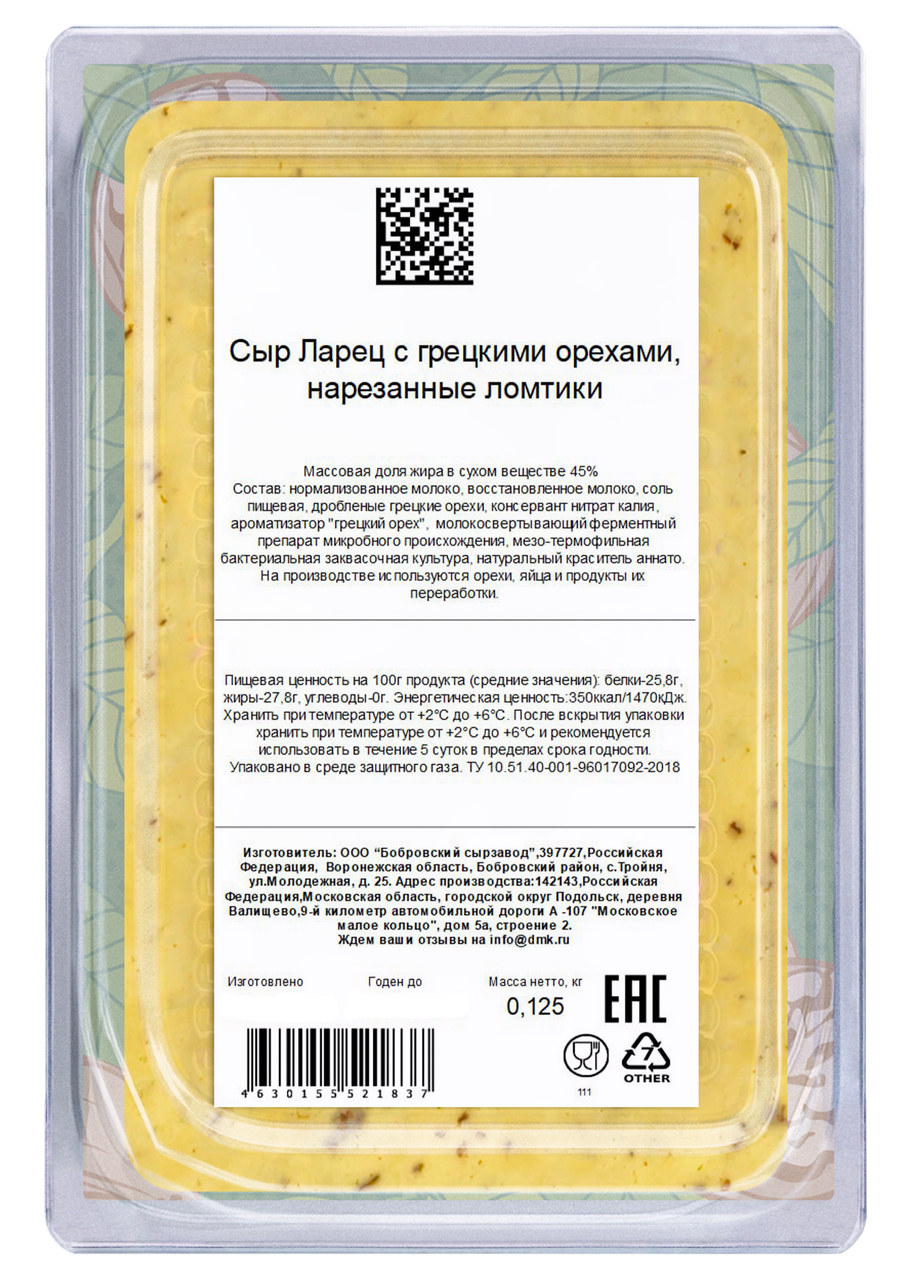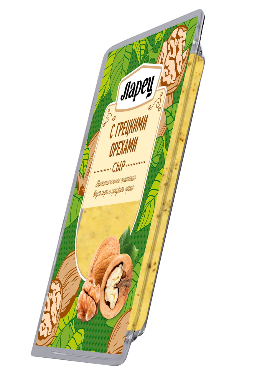 Сыр Ларец с грецкими орехами – это будоражащее сочетание сыра и, уникального по своей природе, грецкого ореха. Консистенция сыра, нежная и пластичная, рисунок на разрезе ажурный, состоит из угловатых глазков с россыпью дробленого грецкого ореха. Терпкость и аромат грецких орехов отлично оттеняют нежный, сливочный вкус сыра, а также питательность орехов придаст хорошее настроение на целый день.
