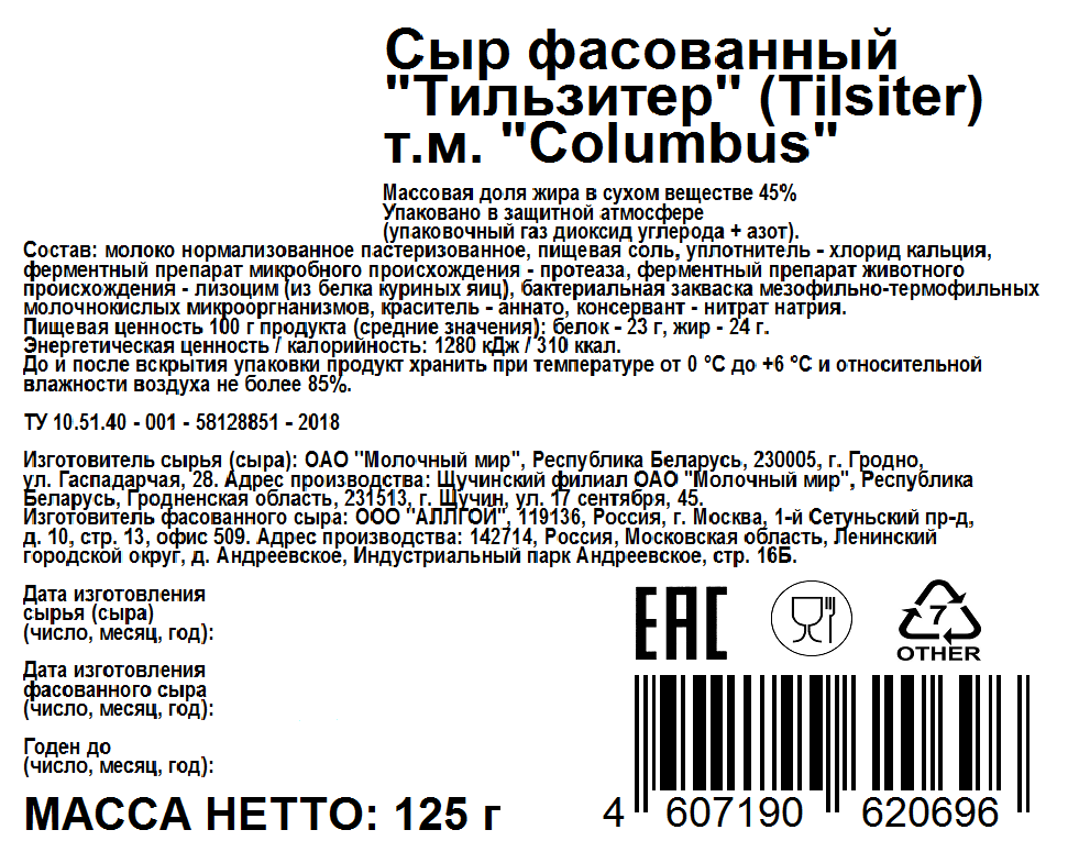 Тильзитер – один из видов полутвёрдых сыров, производство, которого было начато еще в 19 веке. Окрас сыра Тильзитера светло-жёлтый, при этом должен иметь твёрдое состояние, покрытое трещинами и дырочками разных размеров и диаметра. Сыр Тильзитер полезен благодаря своему богатому содержанию витаминов и минералов. Сыр Тильзитер достаточно широко используется в столовом быту: отлично сочетается с ржаным хлебом, прекрасно дополняет вкусы салатов, великолепно подходит к картофельным блюдам, даже с тёмными сортами пивных напитков, дополняет и выявляет вкус вина.