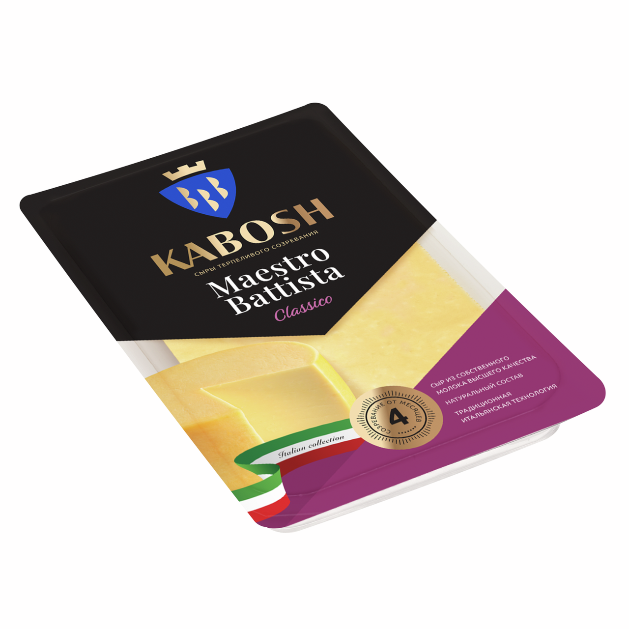 Сыр средней выдержки с выразительным пряным вкусом и не твердой, но плотной текстурой. Он обладает пикантным букетом с нотами трав и пряностей. Создатель, итальянский сыровар Баттиста Атторни, вдохновлялся превосходным сортом Piave. Имеет очень плотную текстуру без глазков. Обладает восхитительным вкусом. Этот сыр в течение 5 месяцев вызревает в особой камере, по микроклимату напоминающей пещеру. Периодически каждую голову чистят вручную специальными щетками и переворачивают. Российский бренд Кабош производит высококачественную продукцию, используя самое современное оборудование и первоклассное сырье. Длительное созревание всех сыров этой марки – важная особенность, позволяющая превратить молочные продукты в гастрономические шедевры.