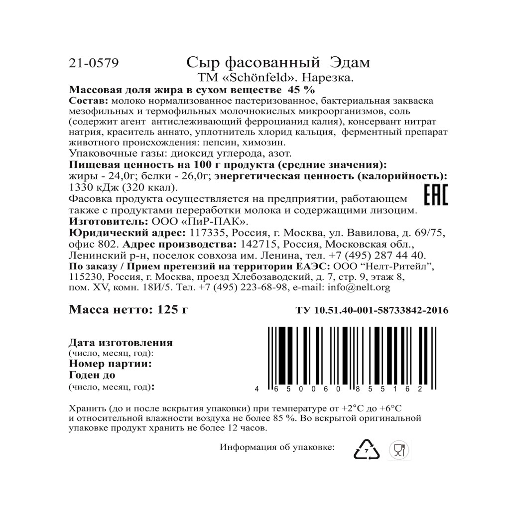 Сыр Schonfeld Эдам полутвердый нарезка 45%, 125г