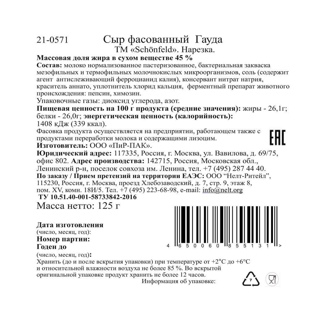 Сыр Schonfeld Гауда полутвердый нарезка 45%, 125г