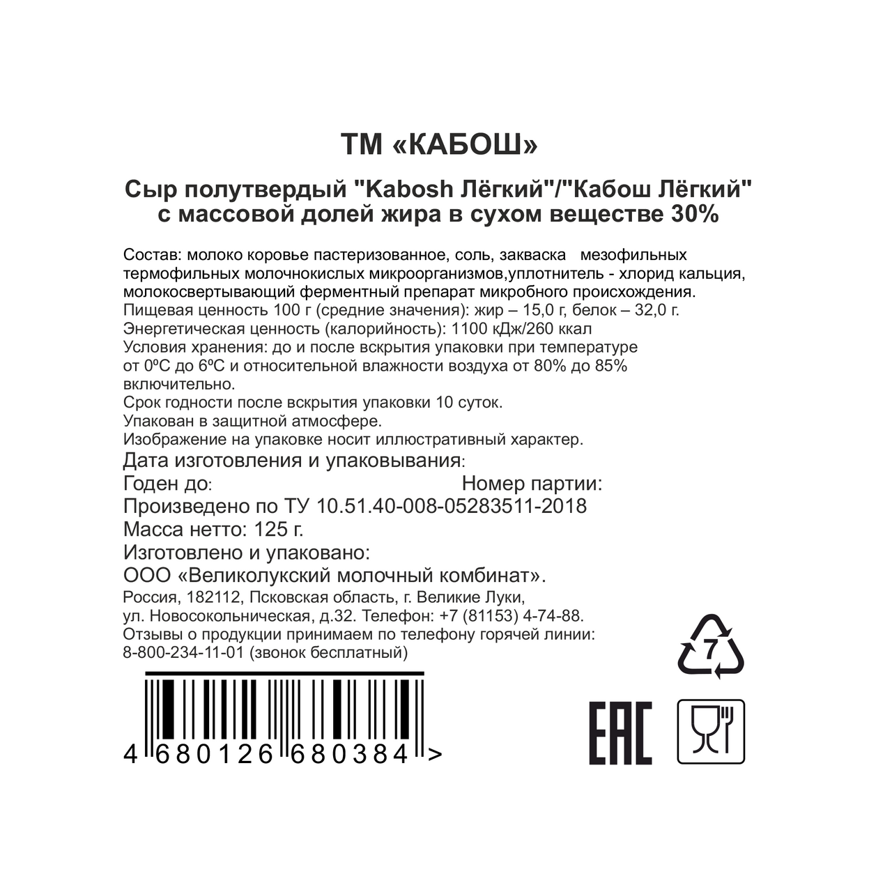 Сыр Кабош легкий нарезка 30%, 125г