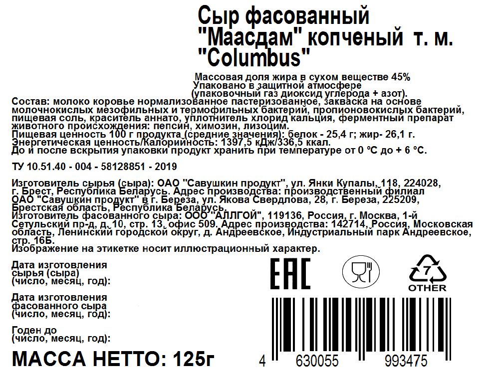 Сыр Columbus Маасдам копченый нарезка 45%, 125 г — продукт с плотной текстурой, ярким, слегка подкопченным вкусом, насыщенным ароматом и долгоиграющим ореховым послевкусием. Он отлично подходит для перекуса, например, в качестве ингредиента для сэндвичей или бутербродов. Также сыр можно добавлять в пасту, использовать для пиццы, дополнять блинчики или несладкие рулеты. В составе продукта отсутствуют заменители молочного жира и растительные жиры, он изготавливается исключительно из отборного молока.