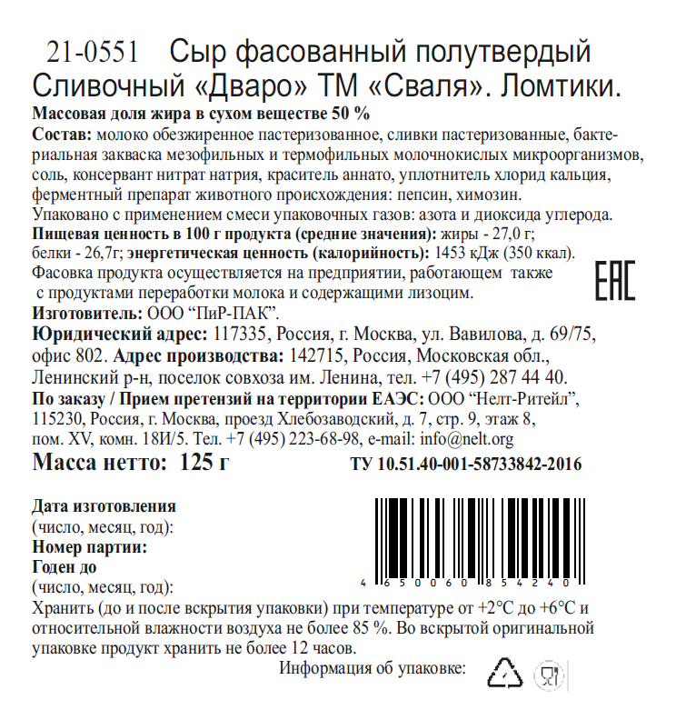 Сыр Сваля Дваро сливочный нарезка 50%, 125г