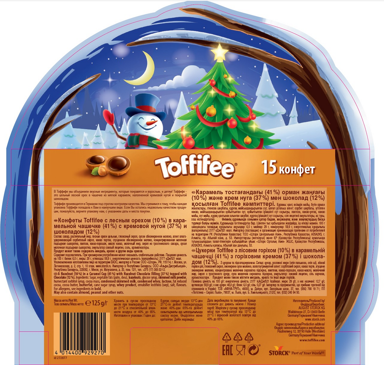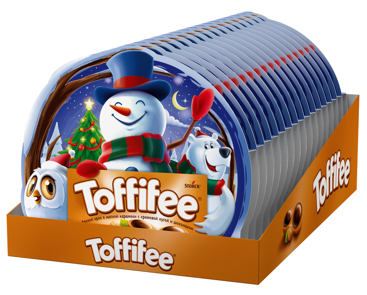 Конфеты Toffifee – цельный лесной орех в чашечке из мягкой карамели, наполненной кремовой нугой и покрытой шоколадом. Используются ингредиенты высочайшего качества. Toffifee - немецкий бренд карамельных конфет , принадлежащий берлинской немецкой компании August Storck KG. Toffifee - это карамельные чашки, содержащие нугу , карамель и лесной орех , увенчанные шоколадной кнопкой. Они продаются в коробках по 4, 12, 15, 24, 30, 48 и 96 штук. Впервые продаваемые в Западной Германии и Австрии в 1973 году, Toffifee продавались как продукт для всей семьи. К 2016 году Toffifee продавался более чем в 100 странах. В США Toffifee продается с альтернативным написанием Toffifay и альтернативным дизайном упаковки. В других странах мира, в том числе в Канаде и Европе , бренд сохраняет свое первоначальное написание и дизайн оранжевой коробки.