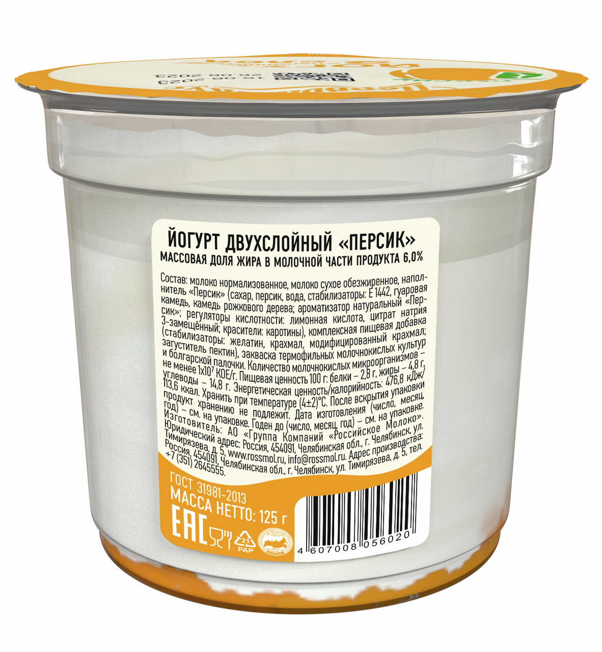 Молоко нормализованное, молоко сухое обезжиренное, наполнитель Персик (сахар, персик, вода, стабилизаторы: Е1442, гуаровая камедь, камедь рожкового дерева; ароматизатор натуральный Персик; регуляторы кислотности: лимонная кислота, цитрат натрия 3-замещенный; красители: каротины), комплексная пищевая добавка (стабилизаторы: желатин, крахмал, модифицированный крахмал; загуститель пектин), закваска термофильных молочнокислых культур и болгарской палочки.