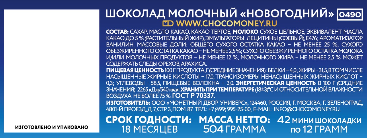 Шоколад Монетный Двор молочный новогодний, 12г x 42 шт идеально подходит для создания сладкого новогоднего настроения. Молочный шоколад обладает богатым и насыщенным вкусом, который порадует не только маленьких, но и взрослых. Он станет отличным выбором для сладкого подарка детям, родителям, бабушке и дедушке или любимым и окунет в атмосферу новогодних праздников. Шоколад изготовлен в соответствии с традиционными российскими стандартами, что гарантирует высокое качество и неповторимый вкус, знакомый многим с детства. Ароматный и сладкий, он удовлетворит даже самые утонченные предпочтения гурманов и станет изысканным дополнением к чаепитию или десертному столу.