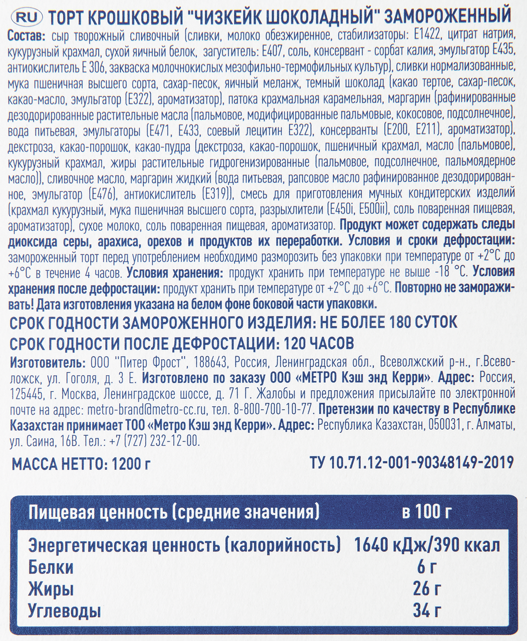 Сыр творожный сливочный сливки, молоко обезжиренное, стабилизаторы: Е1422, цитрат натрия, кукурузный крахмал, сухой яичный белок, загуститель: Е407, соль, консервант - сорбат калия, эмульгатор Е435, антиокислитель Е 306, закваска молочнокислых мезофильно-термофильных культур, сливки нормализованные, мука пшеничная высшего сорта, сахар-песок, яичный меланж, темный шоколад какао тертое, сахар-песок, какао-масло, эмульгатор Е322, ароматизатор, патока крахмальная карамельная, маргарин рафинированные дезодорированные растительные масла пальмовое, модифицированные пальмовые, кокосовое, подсолнечное, вода питьевая, эмульгаторы Е471, Е433, соевый лецитин Е322, консерванты Е200, Е211, ароматизатор, декстроза, какао-порошок, какао-пудра декстроза, какао-порошок, пшеничный крахмал, масло пальмовое, кукурузный крахмал, жиры растительные гидрогенизированные пальмовое, подсолнечное, пальмоядерное масло, сливочное масло, маргарин жидкий вода питьевая, рапсовое масло рафинированное дезодорированное, эмульгатор Е476, антиокислитель Е319, смесь для приготовления мучных кондитерских изделий крахмал кукурузный, мука пшеничная высшего сорта, разрыхлители Е450i, Е500ii, соль поваренная пищевая, ароматизатор, сухое молоко, соль поваренная пищевая, ароматизатор.