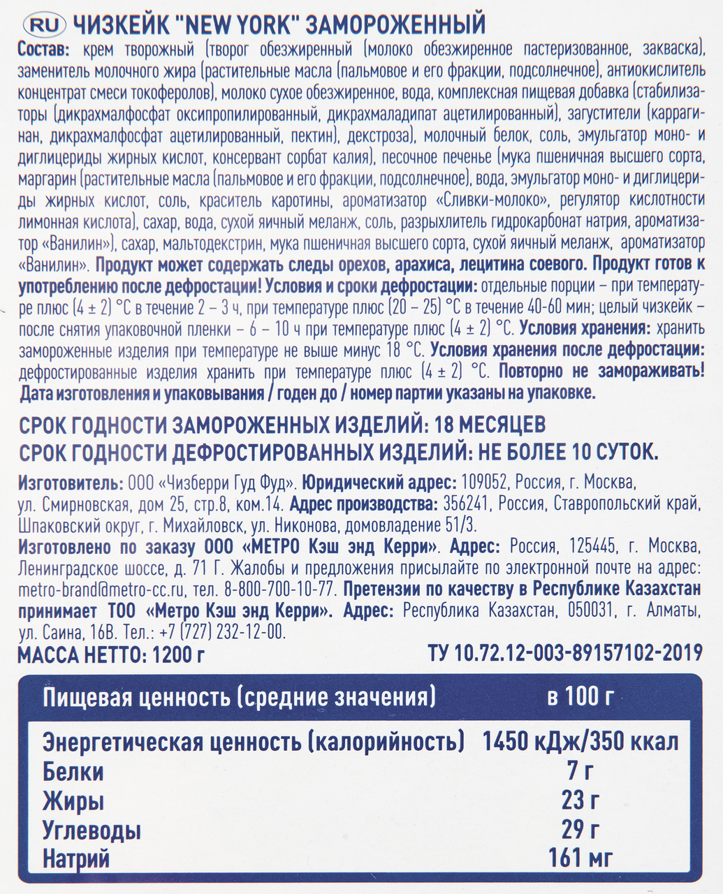 METRO Chef Чизкейк New York 12 порций замороженный, 1.2кг