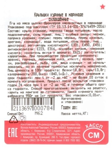 Крыло куриное, маринад (вода питьевая, масло подсолнечное, соль поваренная пищевая, сушеные овощи: чеснок, паприка красная, специи: перец черный, перец красный, орегано, кориандр), вода питьевая, соль поваренная пищевая, декстроза, регуляторы кислотности: Е331, Е450, Е451, антиокислители: Е223, Е316, аскорбат натрия, лимонная кислота, усилитель вкуса и аромата: Е621, загуститель: каррагинан.