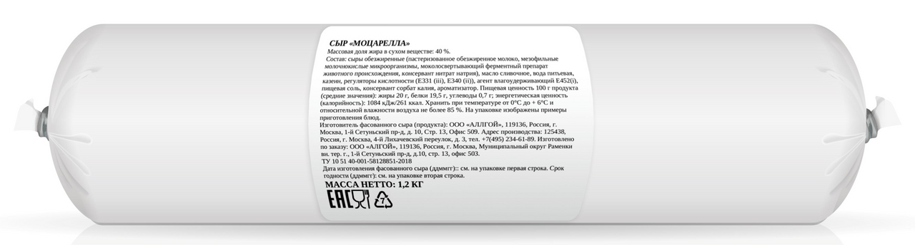 Сыр Terra del Gusto Моцарелла полутвердый 40%, ~1.2кг