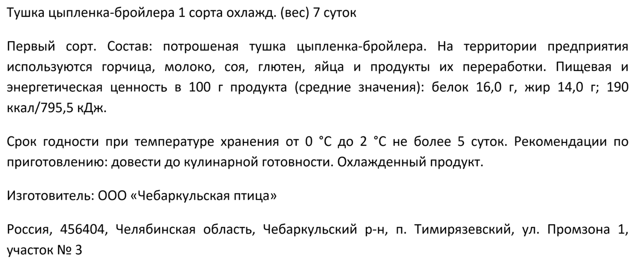 Тушка цыпленка-бройлера Чебаркульская птица охлажденная, ~12кг