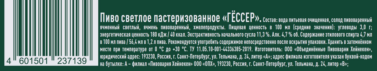 Пиво Гессер светлое, 1.2л