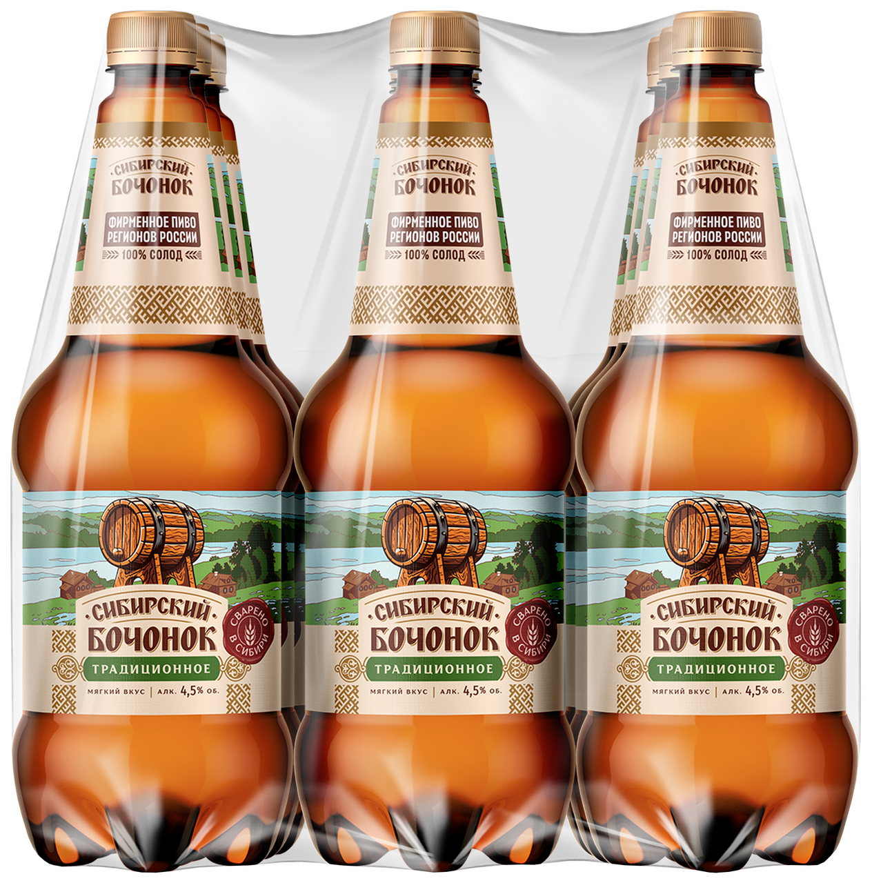 Пиво Сибирский бочонок традиционное, 1.2л - традиционное светлое пиво с мягкой сладостью во вкусе, свойственной сибирскому пиву. Сварено из 100% солода и наполнено душой пивоваров. Это светлое пиво, сваренное по традиционным рецептам, с учетом вкусовых пристрастий сибиряков. Обладает ярким хмелевым ароматом и легким солодовым вкусом.