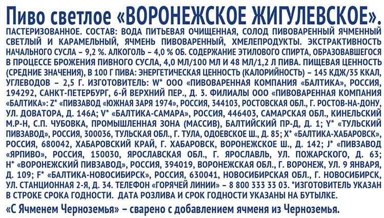 Светлый сорт пива c приятным солодовым ароматом и мягкой горчинкой, сваренный в советских традициях пивоварения. Жигулевское Воронежское сварено специально для жителей Воронежа с сохранением советских рецептов и по стандарту ГОСТ. Имеет небольшую плотность и приятную хмелевую горечь во вкусе. Пиво сварено по традиционной рецептуре исключительно из натуральных ингредиентов: светлого ячменного солода, хмеля и чистой воды. Пиво хорошо сочетается с закусками, орешками, гренками, зелеными салатами с добавлением рыбы или белого мяса, а также горячими блюдами из рыбы и белого мяса без добавления кислых или слишком жирных соусов.