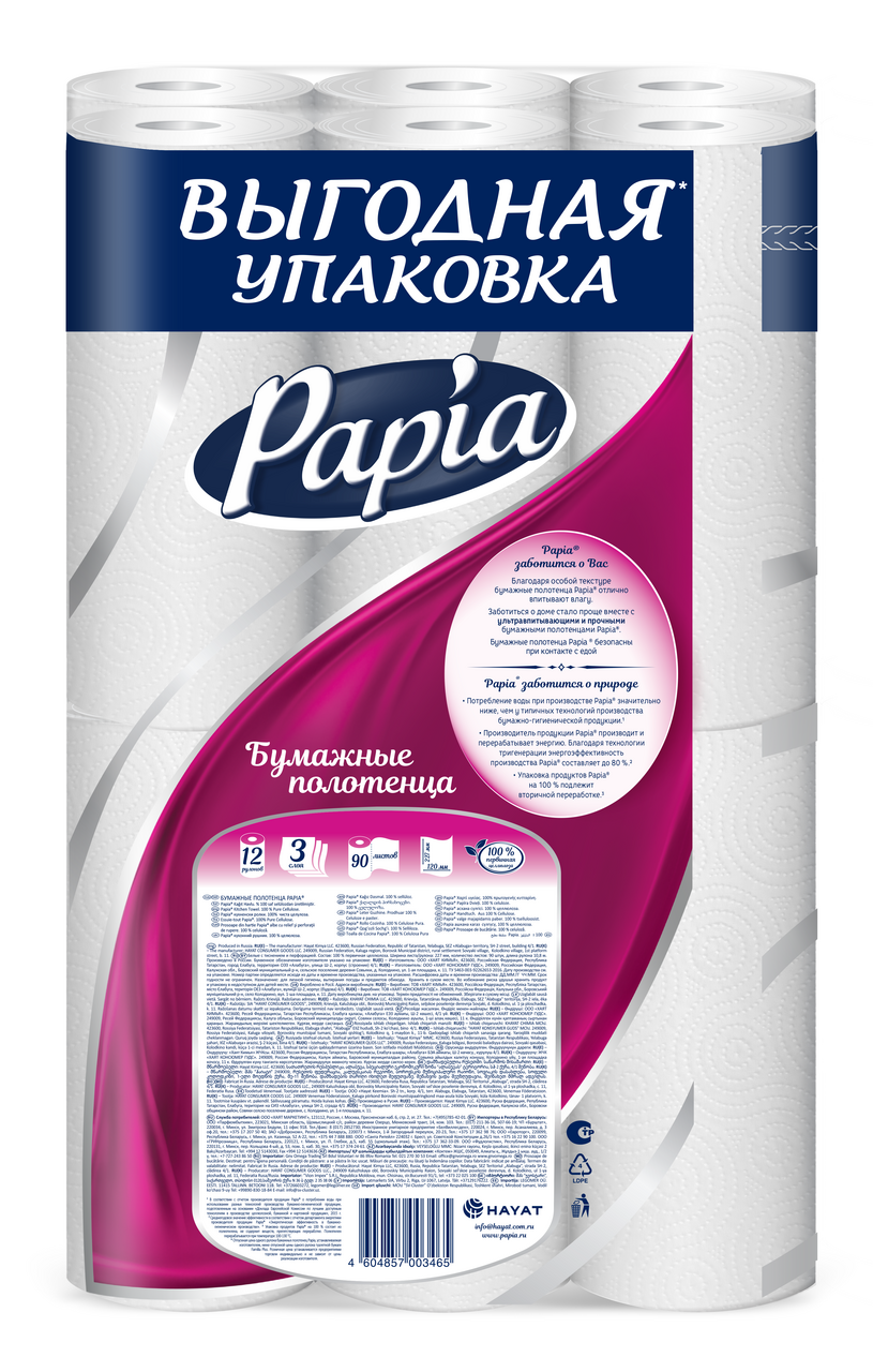 Полотенца бумажные Papia - Ваш практичный и гигиеничный помощник на кухне и дома. Прочные и впитывающие трехслойные бумажные полотенца Papia. Перфорация на пол-листа позволяет более эффективно контролировать расход полотенец, отрывая ровно столько, сколько нужно.