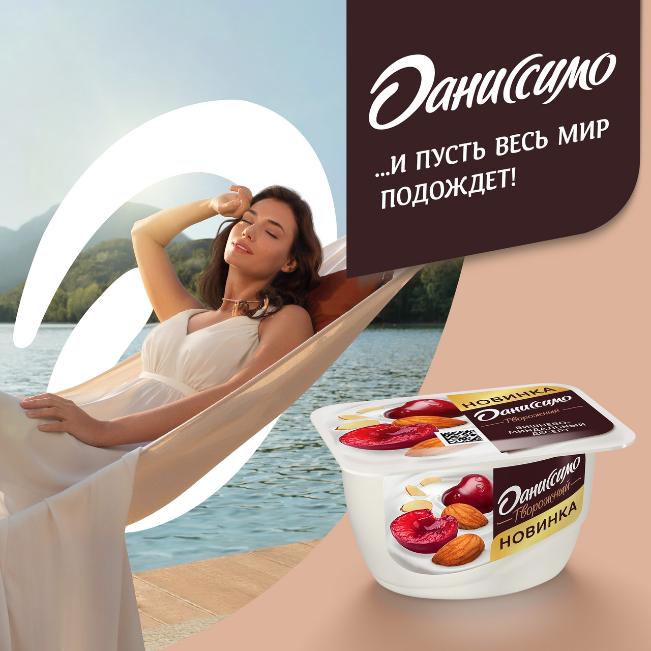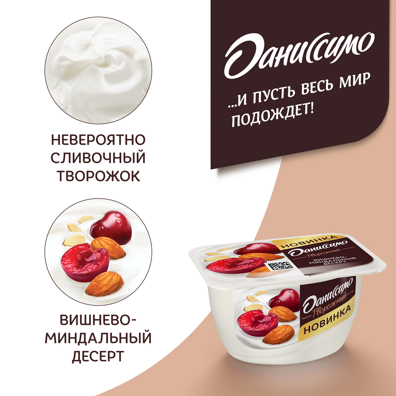 Новый творожный десерт Даниссимо вишнево-миндальный десерт - это идеальное сочетание невероятно сливочной текстуры творожка с кусочками миндаля и сочной вишней. Отлично подойдет в качестве перекуса или десерта.
