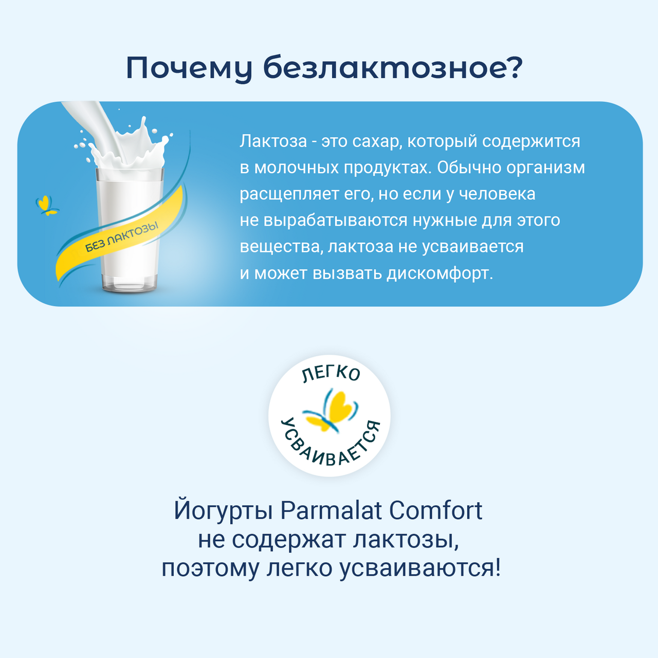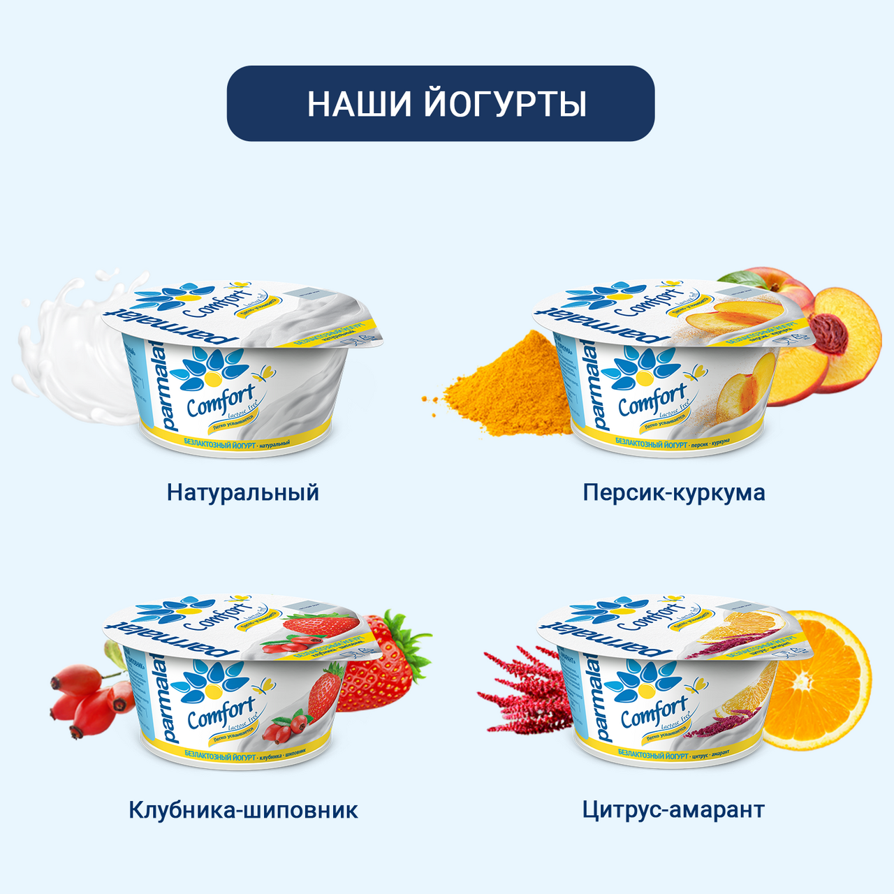 Йогурт безлактозный цитрус-амарант Parmalat 3%, 130г БЗМЖ не содержит лактозы, легко усваивается, чистый состав, без добавления сахара, только натуральная сладость фруктов.