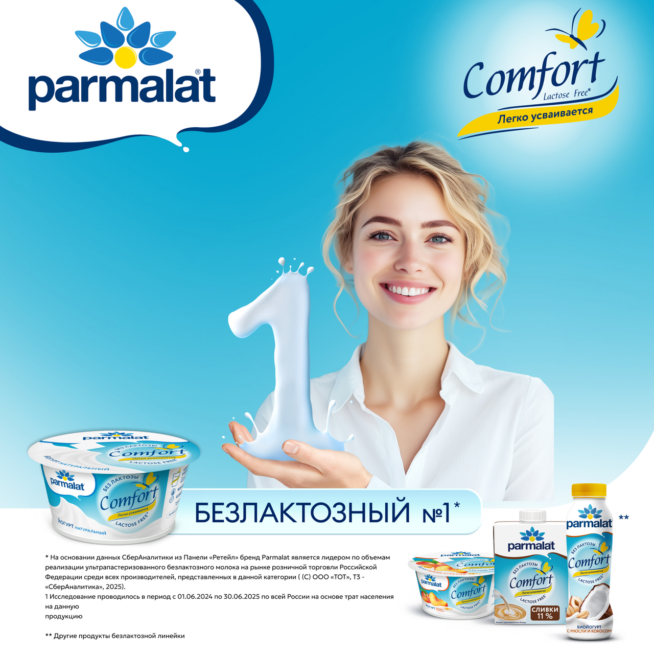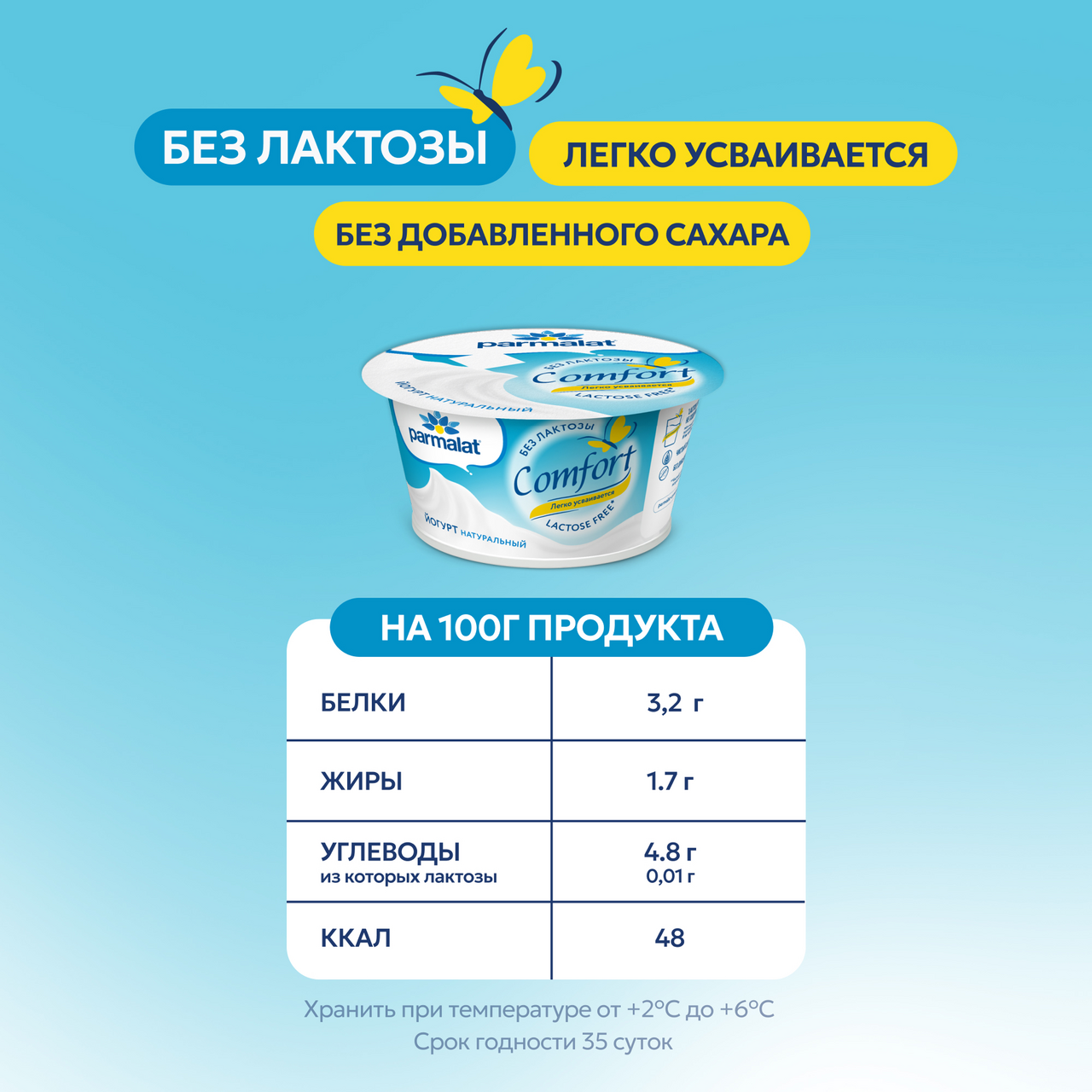 Густой йогурт Parmalat Comfort – прекрасное сочетание нежнейшего натурального йогурта и безлактозной рецептуры. Йогурт не содержит лактозу — молочный сахар, который может плохо усваиваться. Поэтому подходит всем: и тем, кто испытывает дискомфорт при потреблении молока, и тем, кто стремится вести здоровый образ жизни. Продукт не содержит искусственных ингредиентов. Идеален и как самостоятельный продукт, и в сочетании с медом, орехами и ягодами. Наслаждайтесь вкусом без ограничений!