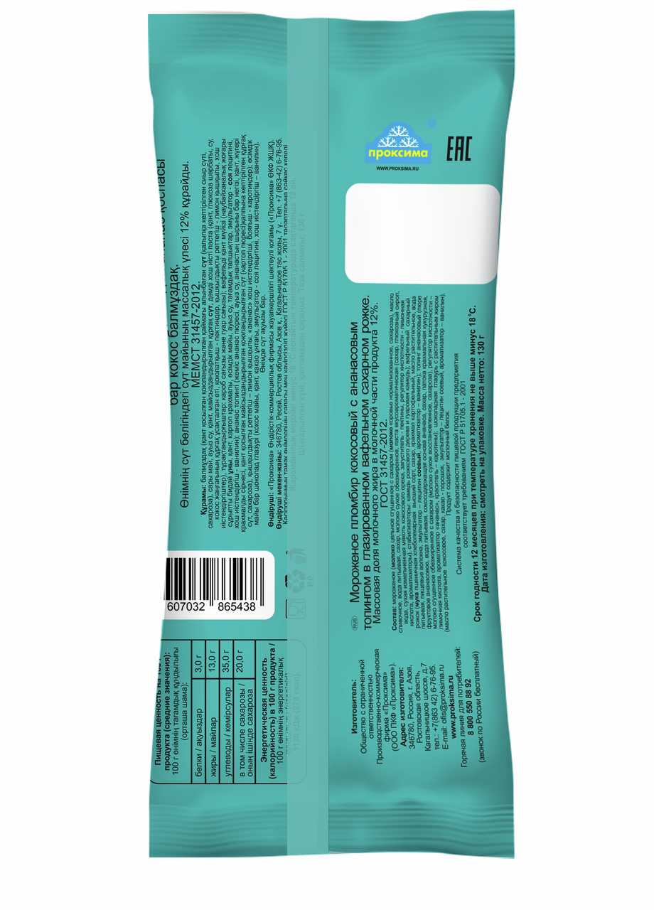 Мороженое (молоко цельное сгущенное с сахаром (молоко коровье нормализованное, сахароза), масло сливочное, вода питьевая, сахар, молоко сухое обезжиренное, паста вкусоароматическая кокосовая (сахар, глюкозный сироп, вода, сухое кокосовое молоко, загуститель - пектины, регулятор кислотности - лимонная кислота, ароматизатор), стабилизаторы: камедь рожкового дерева и гуаровая камедь); вафельный сахарный рожок (мука пшеничная хлебопекарная высший сорт, сахар, крахмал картофельный, масло растительное, вода питьевая, пищевые волокна, эмульгатор – лецитин соевый, ароматизатор ванилин); топинг ананасовый (пюре фруктовое, вода питьевая, сокосодержащая основа ананаса, сахар, патока крахмальная кукурузная, молоко сгущенное обезжиренное с сахаром (молоко сухое восстановленное, сахароза), регулятор кислотности – лимонная кислота, ароматизатор ананас, пищевой краситель – каротины); шоколадная глазурь с растительным жиром (масло растительное кокосовое, сахар, какао - порошок, эмульгатор – лецитин соевый, ароматизатор ванилин).