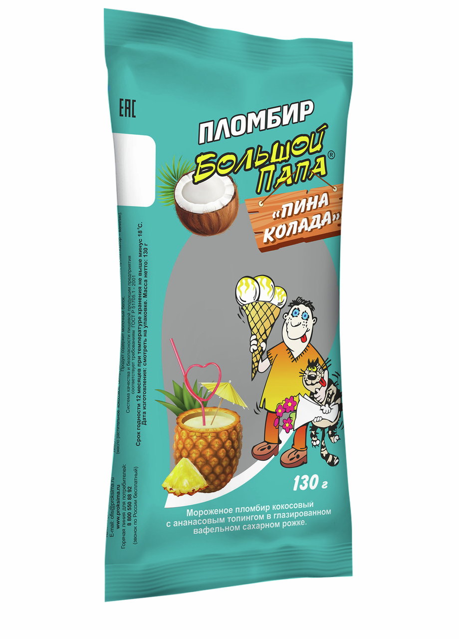 Мороженое пломбир Большой папа рожок Пина колада Кокосовое с ананасовым топингом в вафельном рожке, 130г